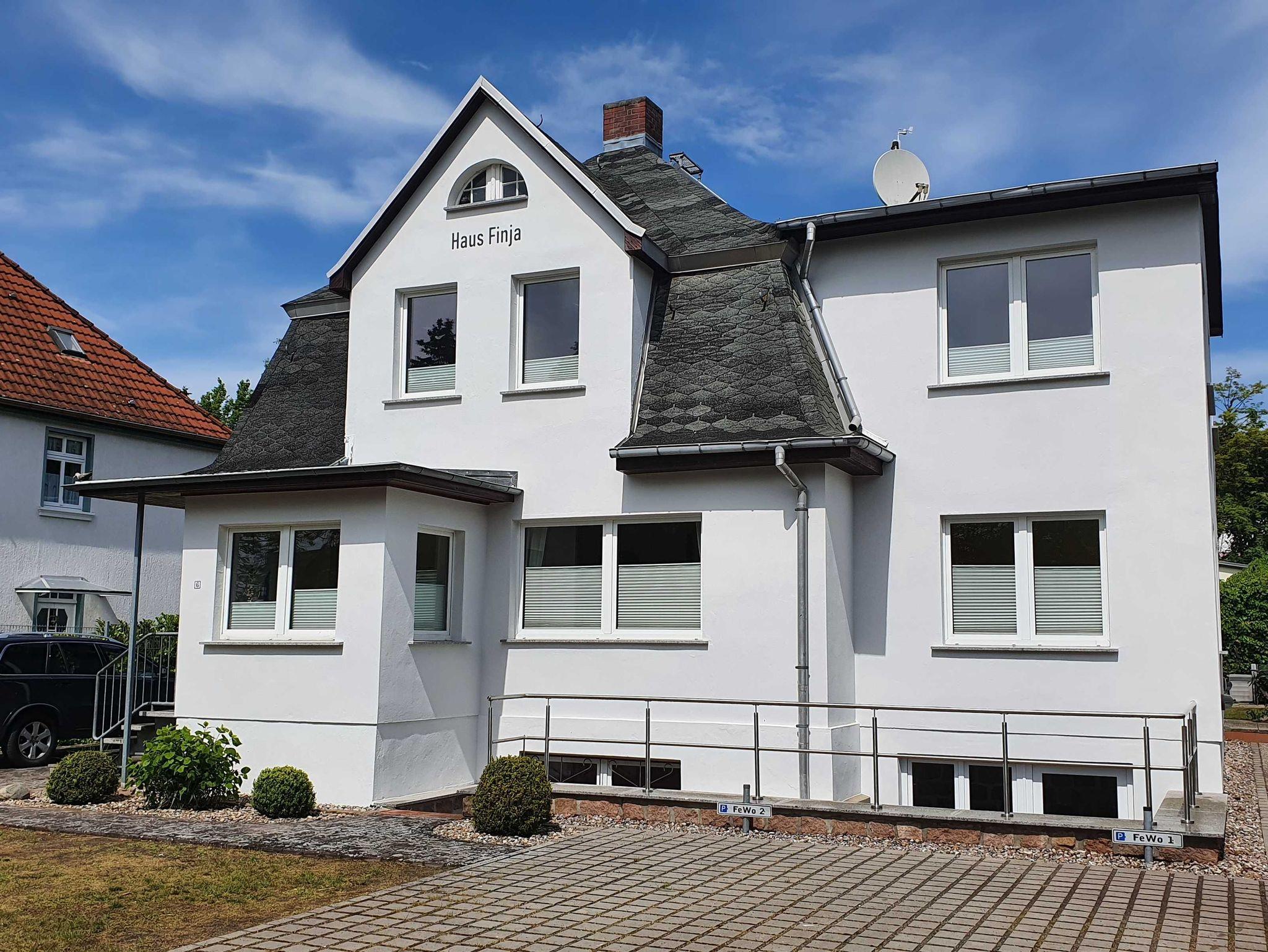 Das Ferienhaus Finja im stil einer Villa verfügt über die Ferienwohnungen 1 und 2 sowie im hinteren Bereich des Grundstücks über einen separaten Bungalow, hier befindet sich die Ferienwohnung 4.