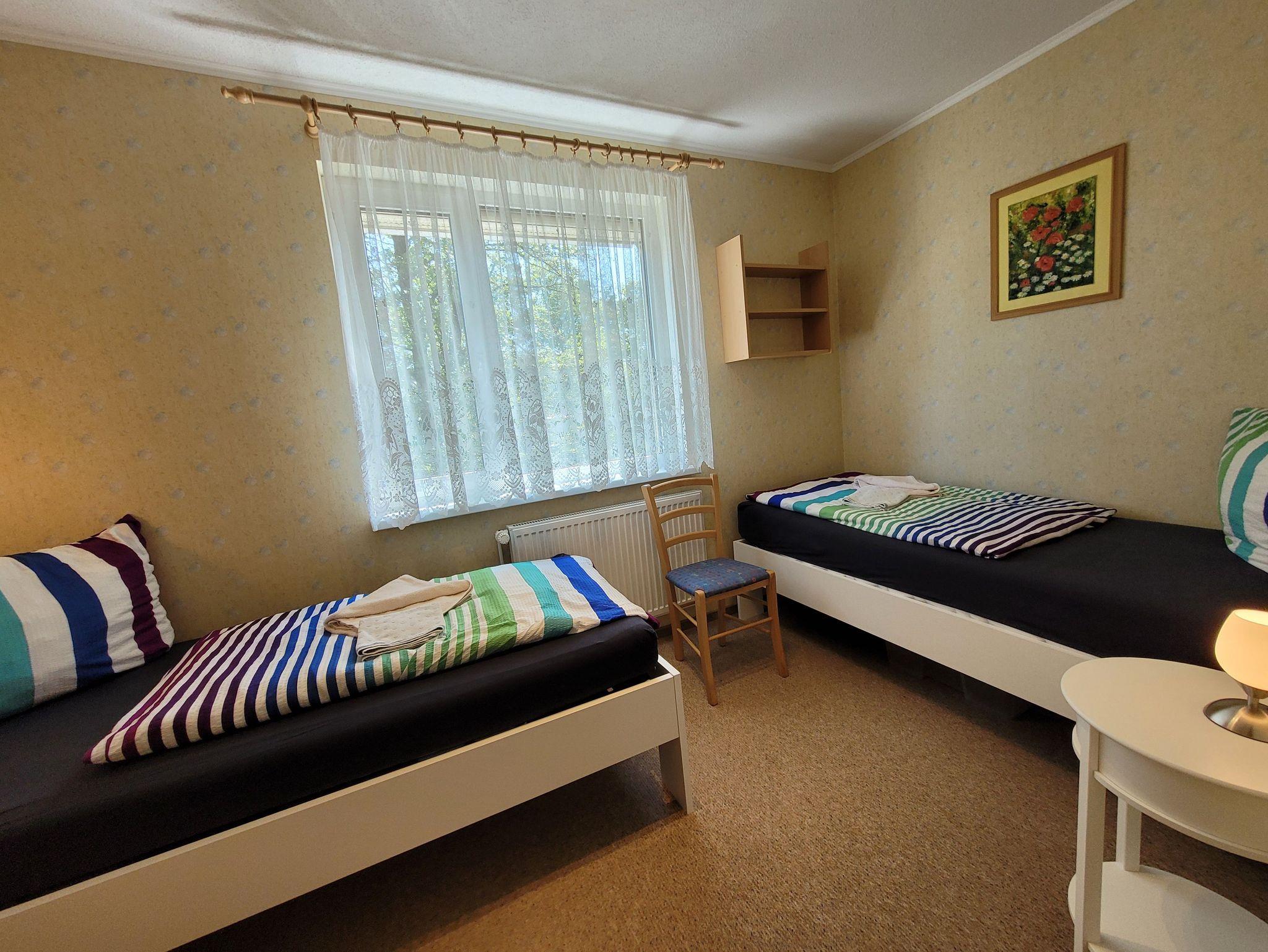 Unser Ferienhaus liegt ca.15 Geh-Minuten vom Strand entfernt in einer ruhigen Wohnlage. Die komplett eingerichtete Ferienwohnung mit Wohnzimmer, zwei Schlafzimmern mit einem Doppelbett und einmal zwei Einzelbetten, Küchenzeile, Dusche, WC ,Flur und großem Balkon/Terrasse würde für Sie bereitstehen. Zur Ausstattung gehören weiter Radio, Fernseher, einmalig Bettwäsche und Handtücher. In der Küchenzeile sind Mikrowelle, Kaffeemaschine, Eier-und Wasserkocher und Toaster sowie ein 2-Platten-Kocher, Kühlschrank und Geschirr vorhanden. Eine Aufbettung ist im Wohnzimmer nach Absprache auf dem ausziehbarem Sofa möglich.