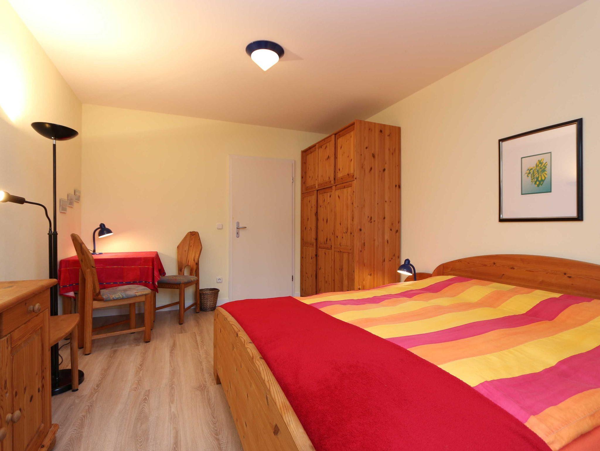• Das Schlafzimmer ist mit Doppelbett (180 x 200 cm) für 2 Personen, einem Kleiderschrank, Tischgruppe, mit Radiowecker und einem Kinderbett (120 x 60 cm) ausgestattet.
