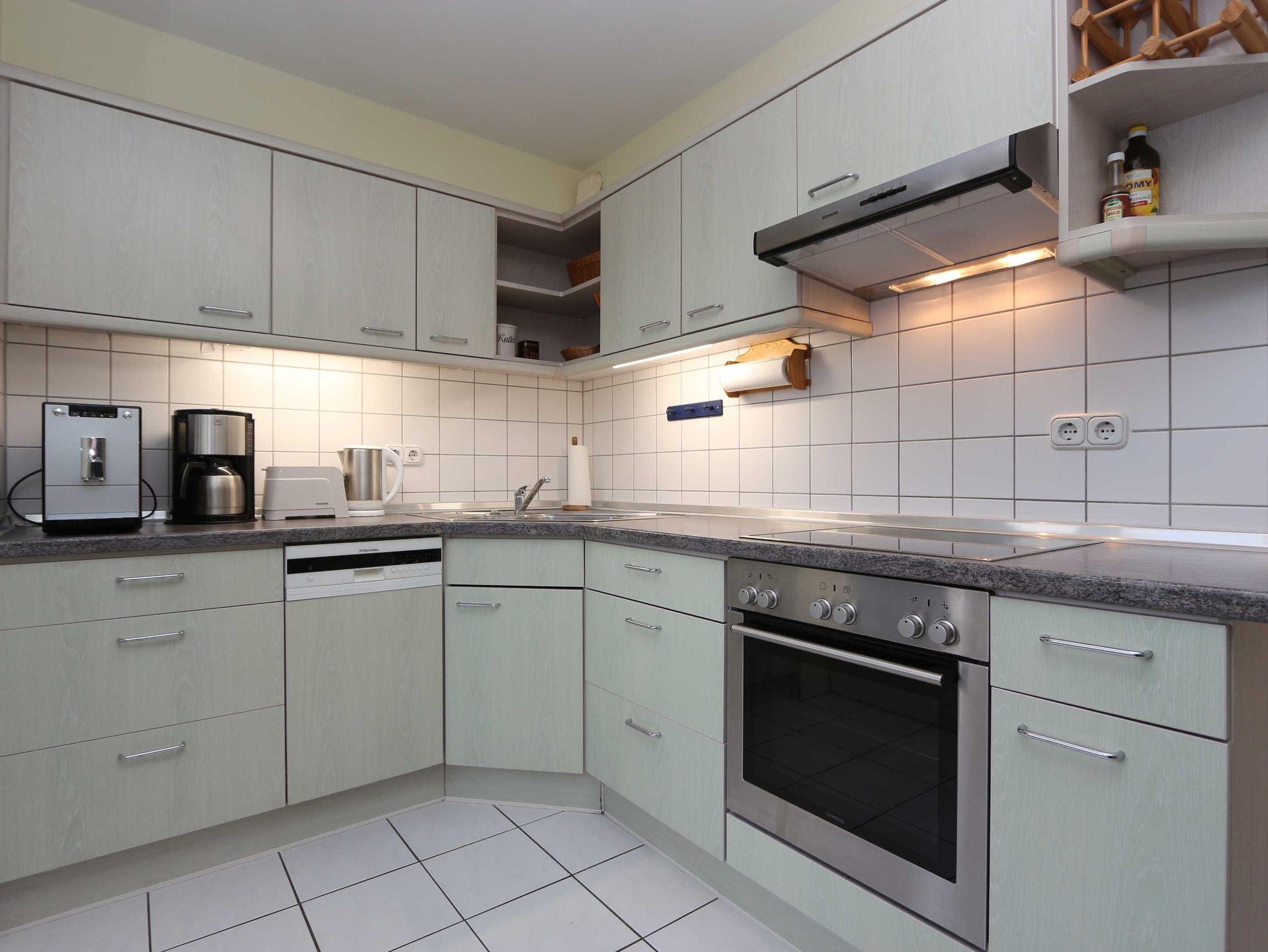 • Komplett eingerichtete Einbauküche mit Geschirrspüler, Herd, Mikrowelle, Kühlschrank mit Gefrierfach, Toaster, Kaffeemaschine, Wasserkocher, Handmixer, reichlich Geschirr
