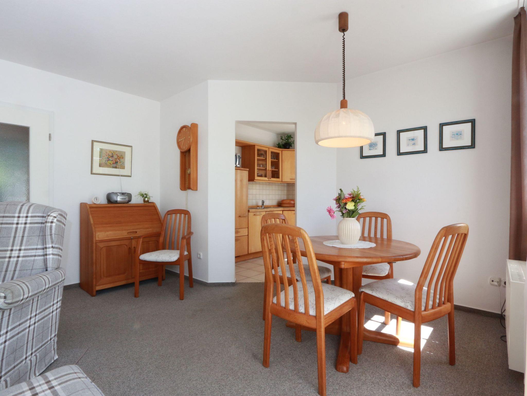 Die 2-Zimmer-Ferienwohnung kann mit bis zu 2 Personen belegt werden (ca. 51 m²) im 1.OG mit Wohn- und Esszimmer, 1 Küche, 1 Schlafzimmer, 1 Bad und 1 Balkon.