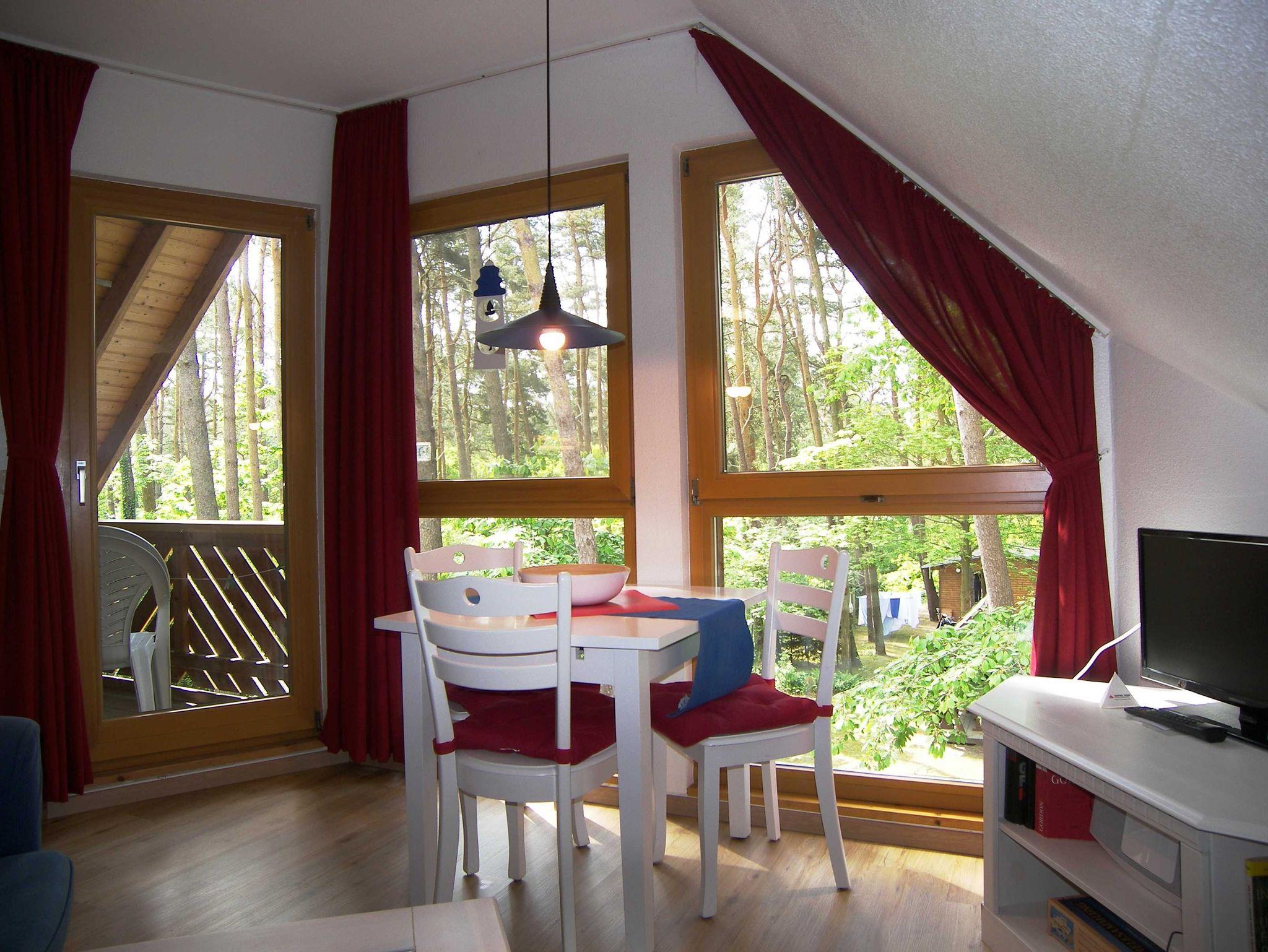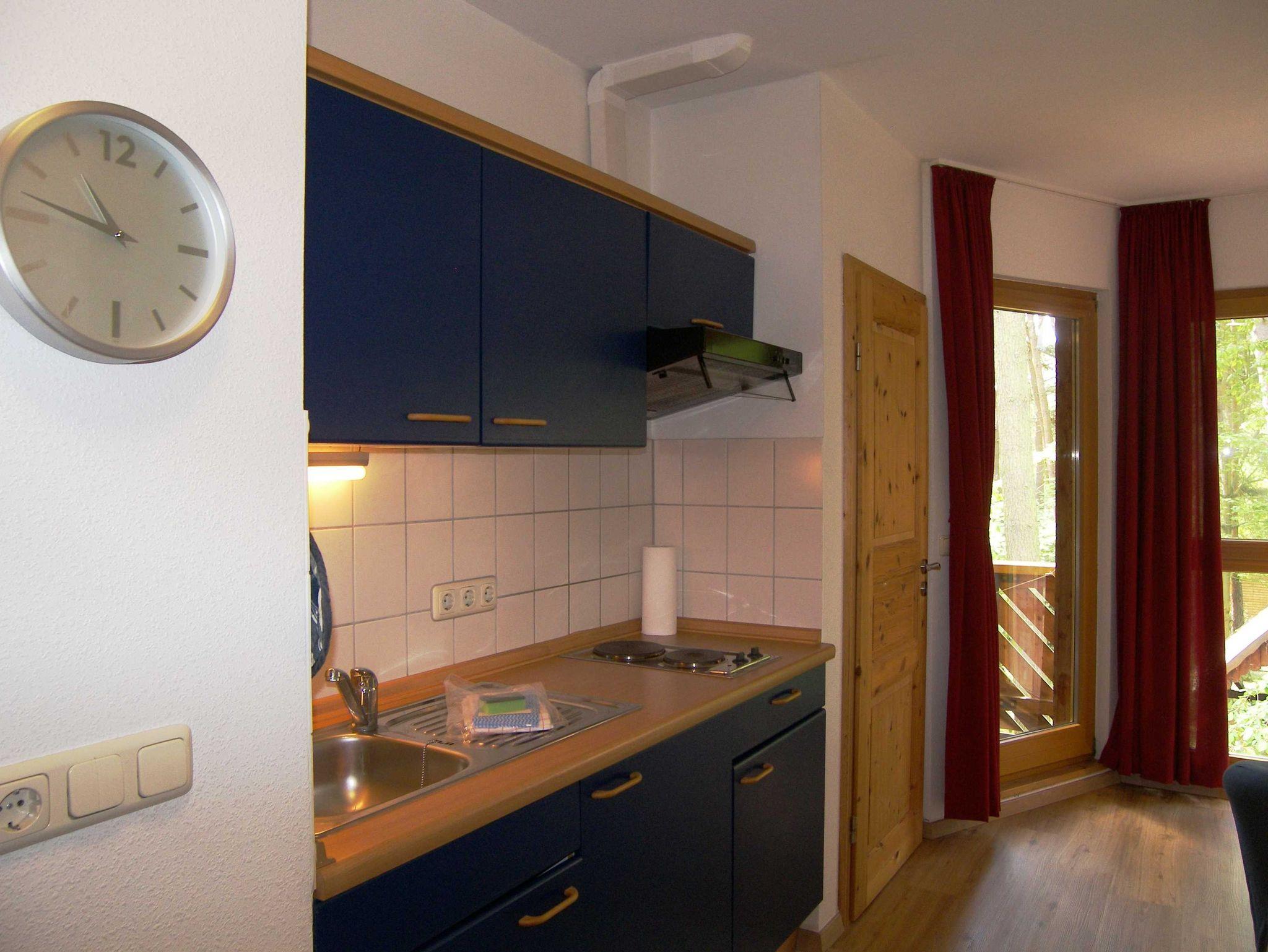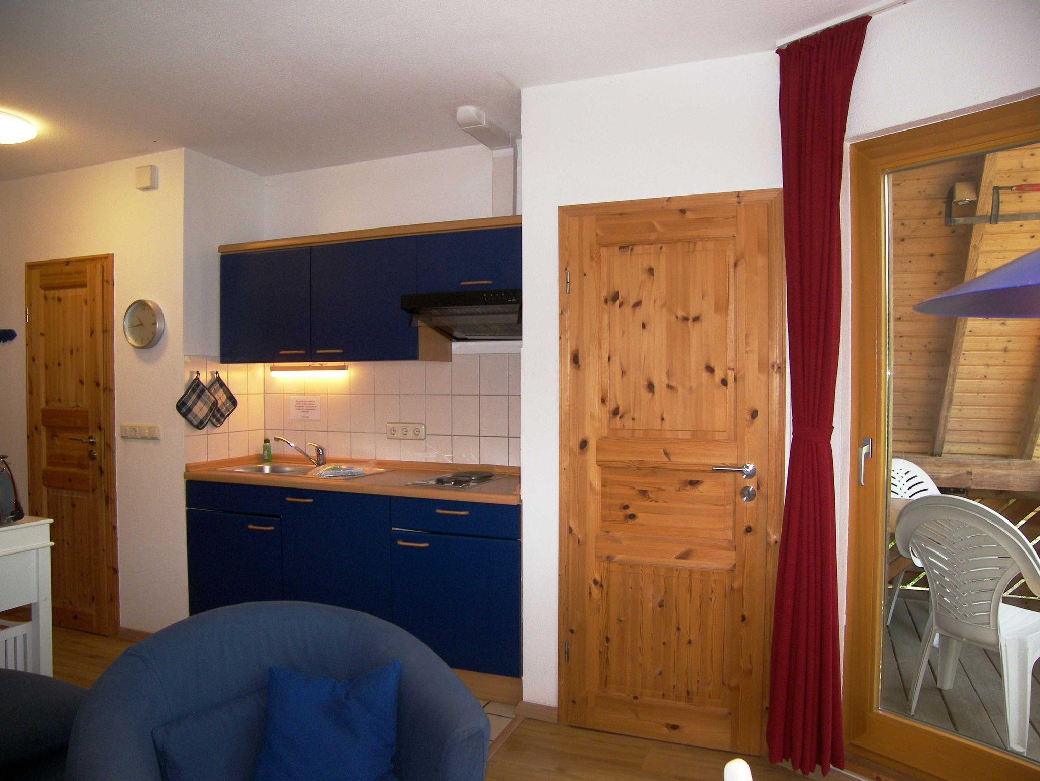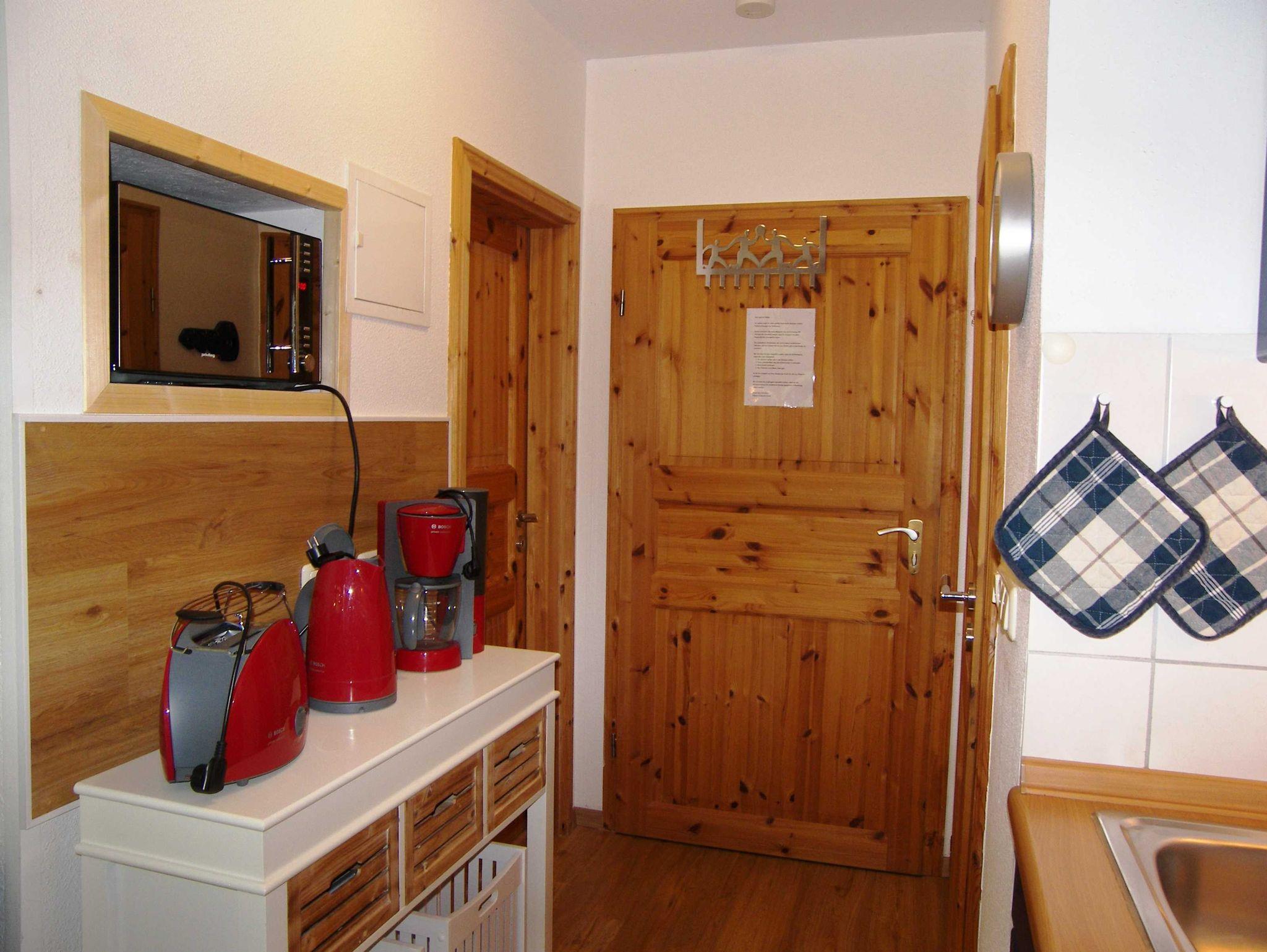 Die normale Küchenausstattung mit Tellern, Pütt und Pann, Gläsern etc. wird durch eine Mikrowelle ergänzt. Außerdem finden Sie Kaffeemaschine, Toaster, Eierkocher, elektrischen Handmixer und Mikrowellengeschirr. Die Küche verfügt weiterhin über einen Zweiplattenherd. Den möblierten Balkon mit Blick ins Grüne erreichen Sie vom Wohnzimmer aus.