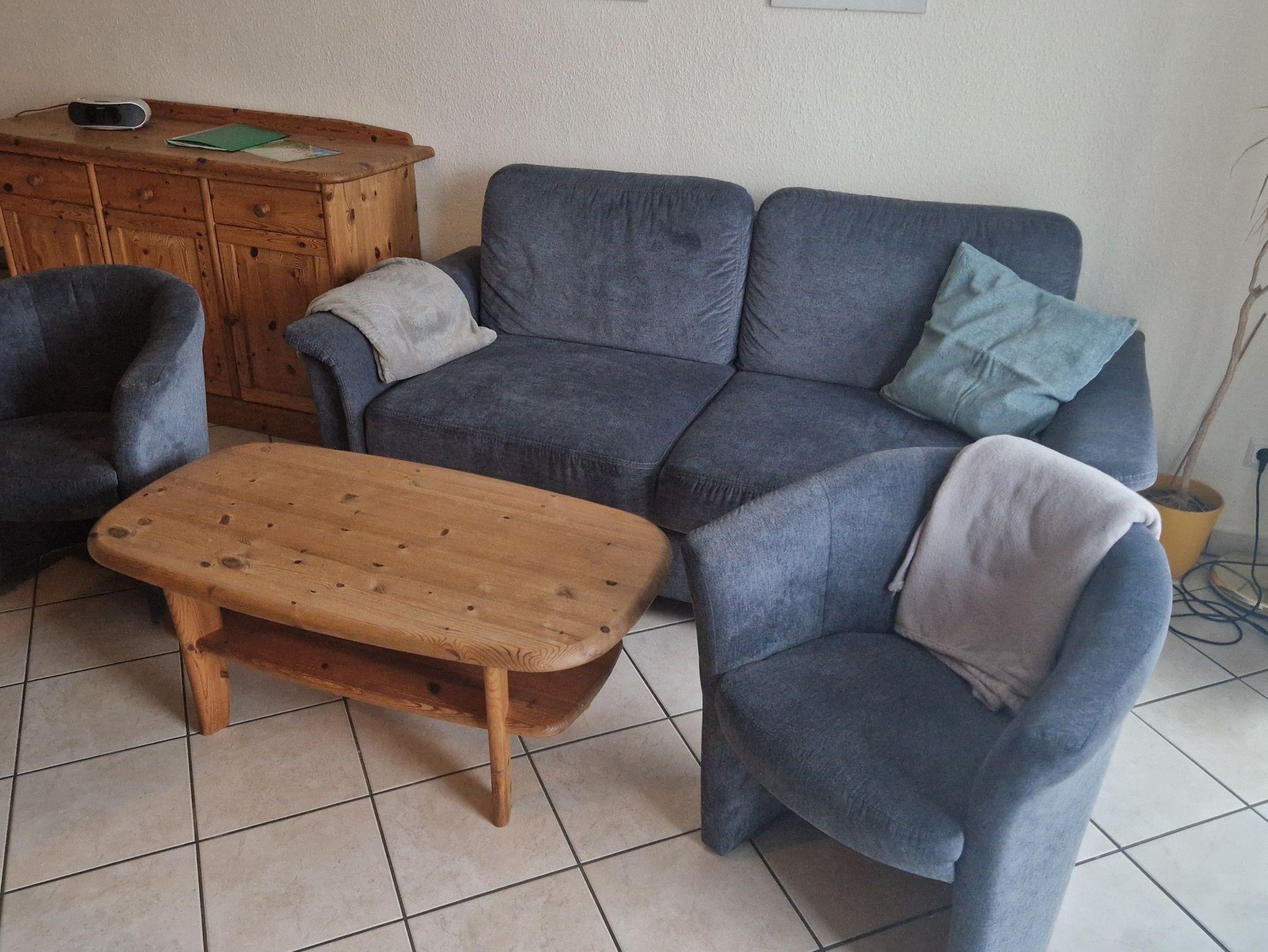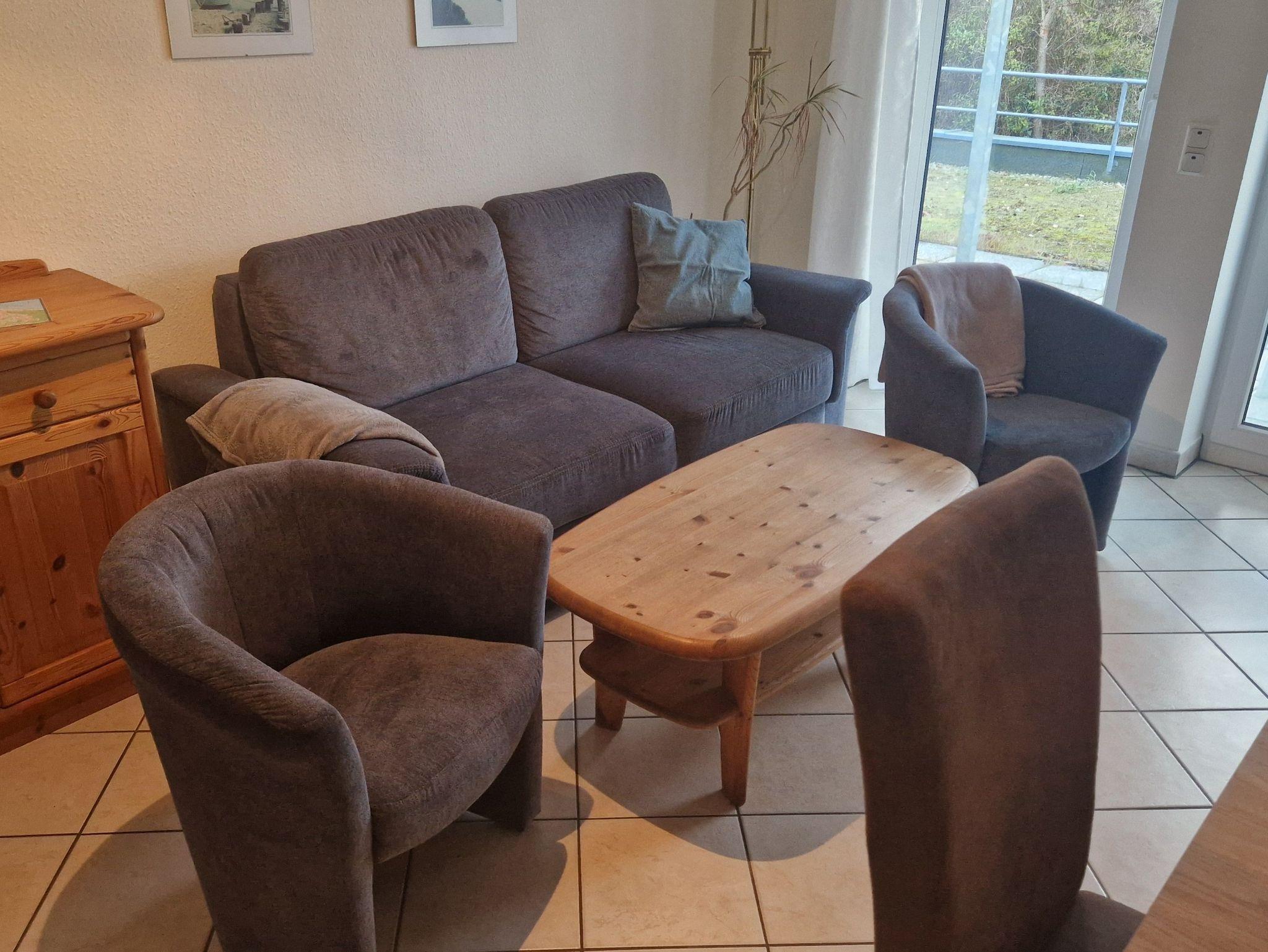 • Neben dem Esstisch lädt eine gemütliche Sofa-Sitzgruppe zum Verweilen ein. Eine Aufbettung ist möglich, da die Couch in ein Doppelbett umgewandelt werden kann.