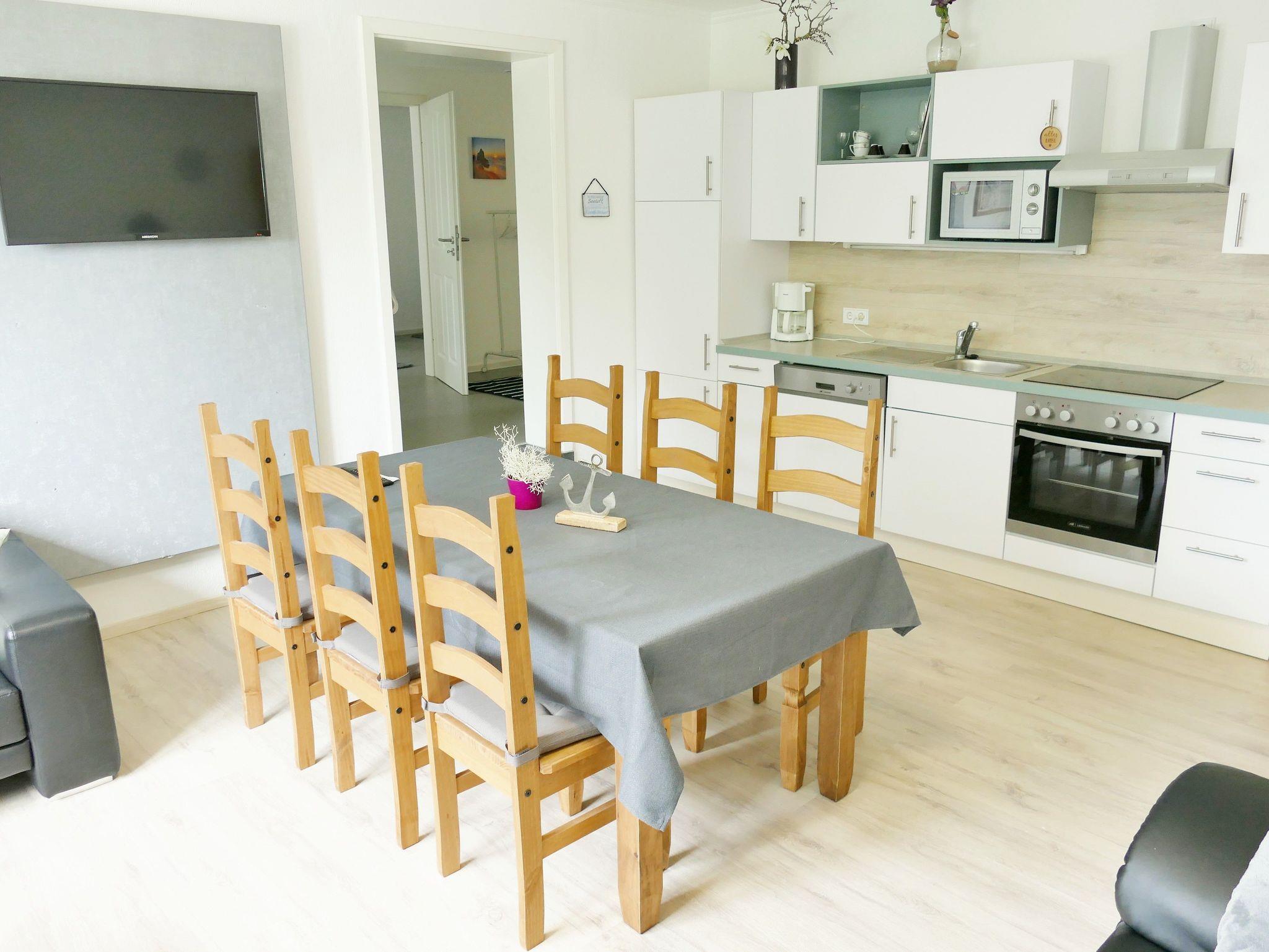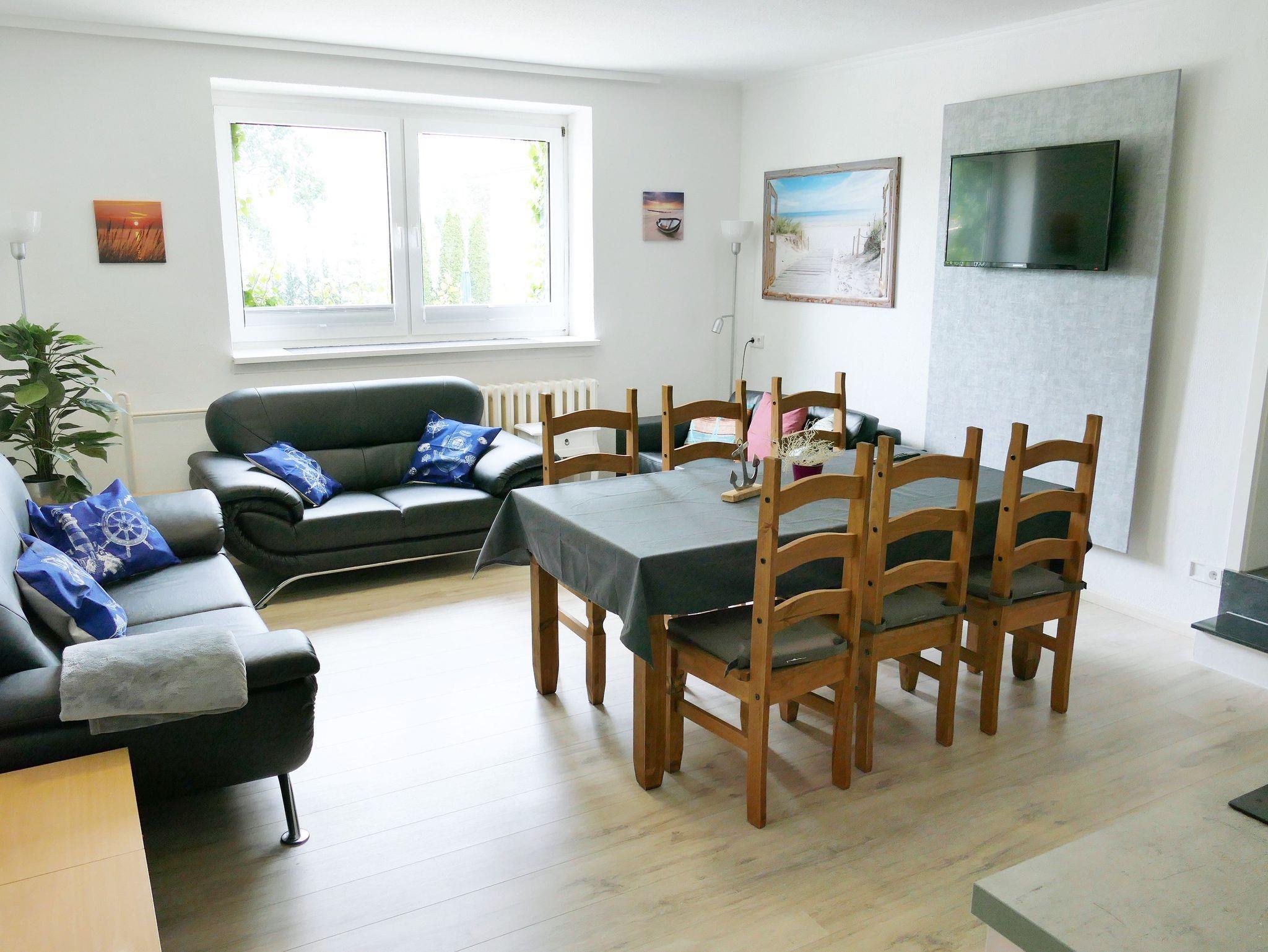 Die 140 qm große und gemütliche Ferienwohnung in Hochparterre ist für bis zu 6 Personen ausgestattet. Sie besteht aus einem Wohn-und Essraum mit eingebauter Küche und Esstisch, sowie einer Sitzlandschaft und TV. Der Küchenbereich ist mit Kühlschrank, Backofen, Spülmaschine u.v.m. ausgestattet.