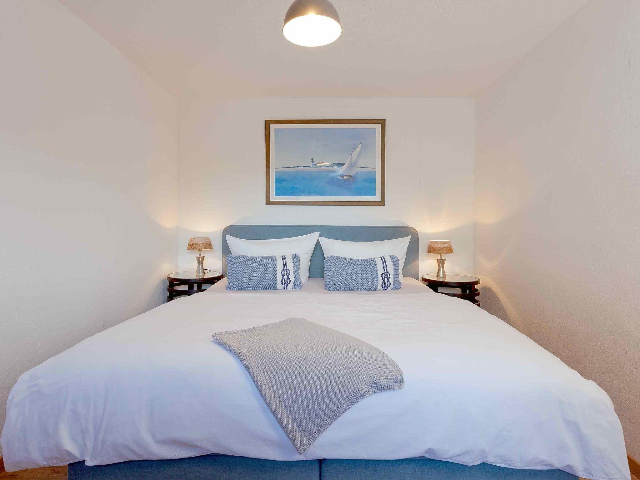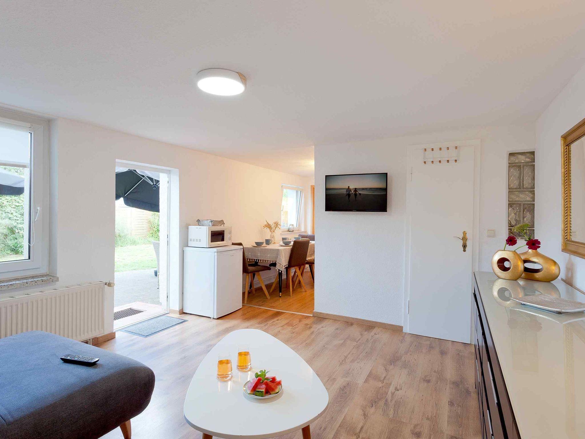 Lütte Liebe, 3-Zimmer-Wohnung 55 m2, im Erdgeschoss. Modern und gemütlich eingerichtet: Wohnzimmer mit Sat-TV, Radio und CD. Ausgang zur Terrasse. Durchgangszimmer mit 1 Doppelbett. 1 Doppelzimmer. Kochnische (4 Kochplatten, Backofen, Geschirrspüler, Toaster, Wasserkocher, Mikrowelle, elektrische Kaffeemaschine) mit Esstisch. Dusche/WC. G-Heizung. Terrasse teilweise überdacht. Terrassenmöbel. Zur Verfügung: Kinderhochstuhl, Babybett. Internet (Wireless LAN, gratis). Bitte beachten: Nichtraucher-Unterkunft. Haustiere/Hunde erlaubt. Rauchmelder.