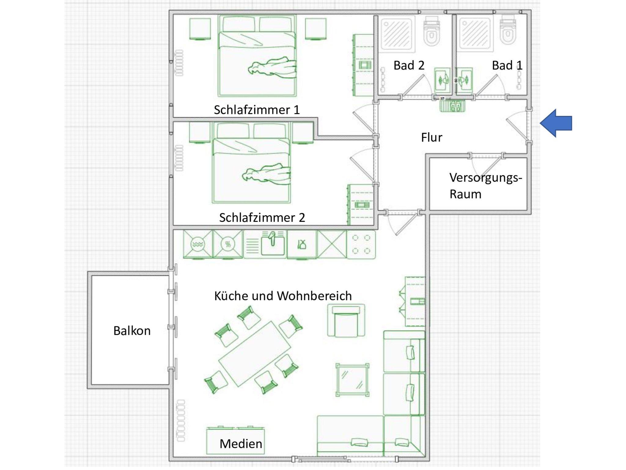 Die Wohnung ist ca. 60qm groß und mit hochwertigen Kernbuche-Massivholzmöbeln eingerichtet. Sie verfügt über einen großen Wohnraum mit Ledersitzgarnitur, Küchenzeile, zwei Schlafzimmer und zwei Bäder mit Dusche, WC und Spiegelschrank.