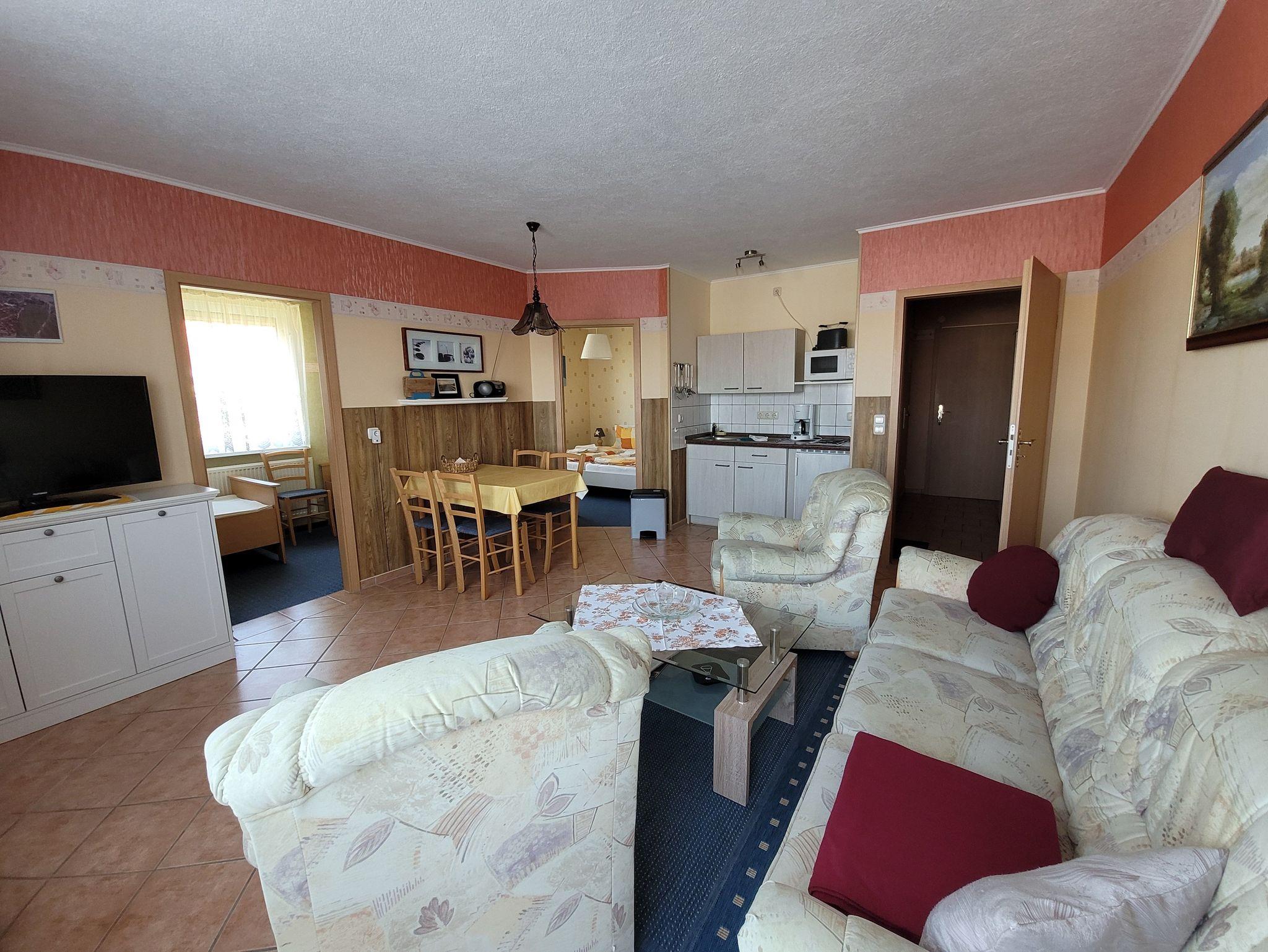 Die komplett eingerichtete Ferienwohnung mit Wohnzimmer, zwei Schlafzimmern mit einmal einem Doppelbett und einmal zwei Einzelbetten, Küchenzeile, Dusche, WC, Flur und großer Terrasse/Balkon würde für Sie bereitstehen. Zur Ausstattung gehören weiter Radio, Sat- Fernseher, einmalig Bettwäsche und Handtücher. In der Küchenzeile sind Mikrowelle, Kaffeemaschine und Toaster, Eier- und Wasserkocher sowie ein 2- Platten-Kocher, Kühlschrank und Geschirr vorhanden.