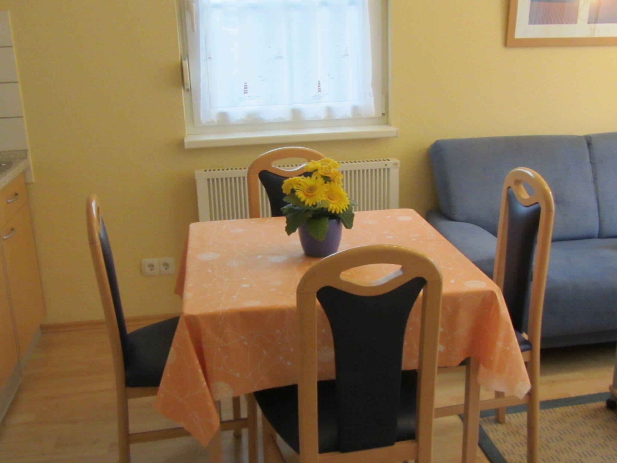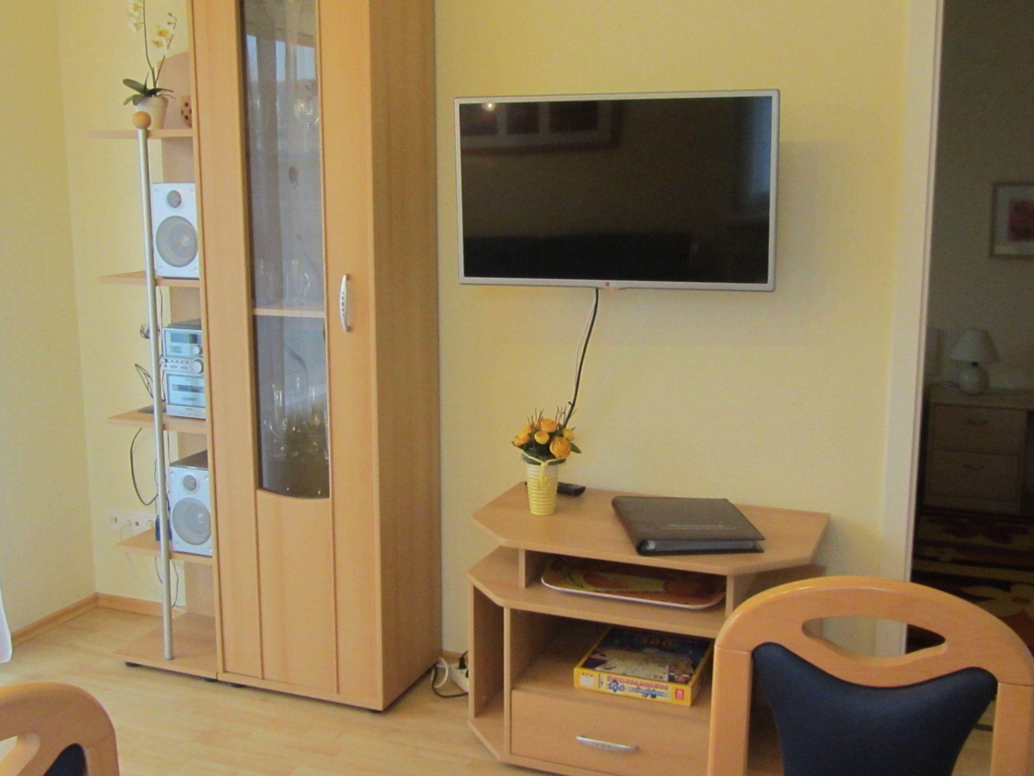 Schöne 3-Zimmer Erdgeschosswohnung mit großer Terrasse, in einer liebevoll angelegten Ferienanlage. Die Ferienwohnung „Kiefernmöwe“ ist im Wohnbereich ausgestattet mit einer gemütlichen Couch, Flachbild TV und einer offenen Küche mit Essbereich.