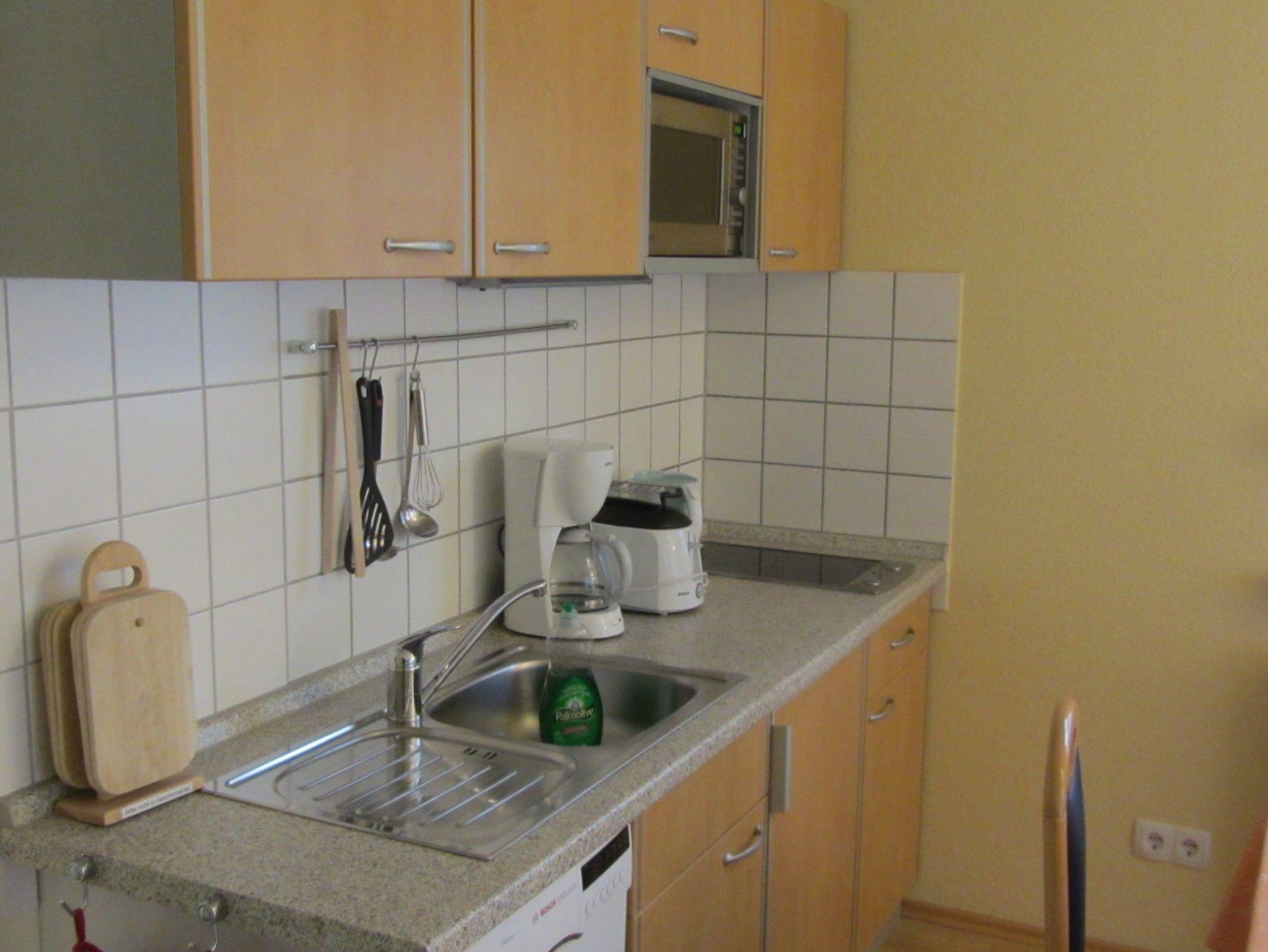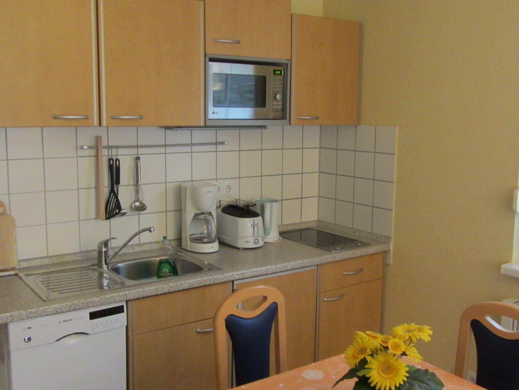 gut eingerichtete Küche, Esstisch mit 4 Stühlen, Geschirrspüler, Cerankochfeld, Mikrowelle, Kaffeemaschine, Toaster, Wasserkocher.