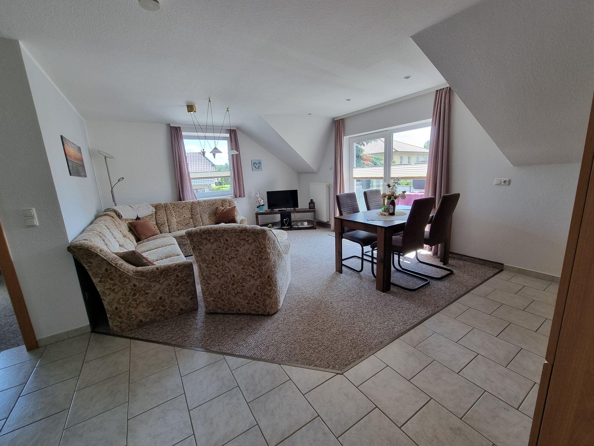 Die Ferienwohnung hat ein Schlafzimmer mit einem großen Doppelbett und ein Wohnbereich mit offener Küche. Es gibt eine gemütliche Couch, SAT-TV und eine gut ausgestattete Küche mit Essbereich.