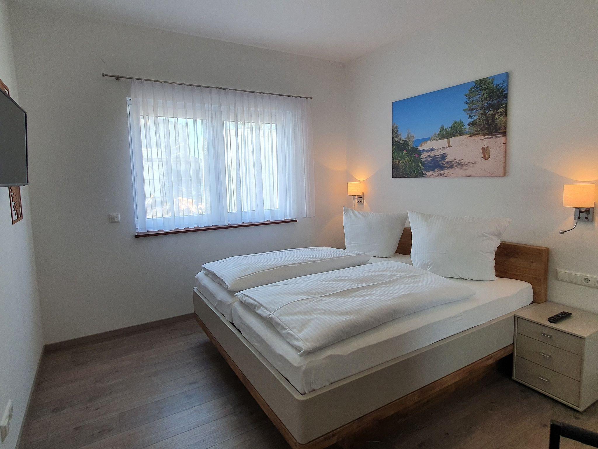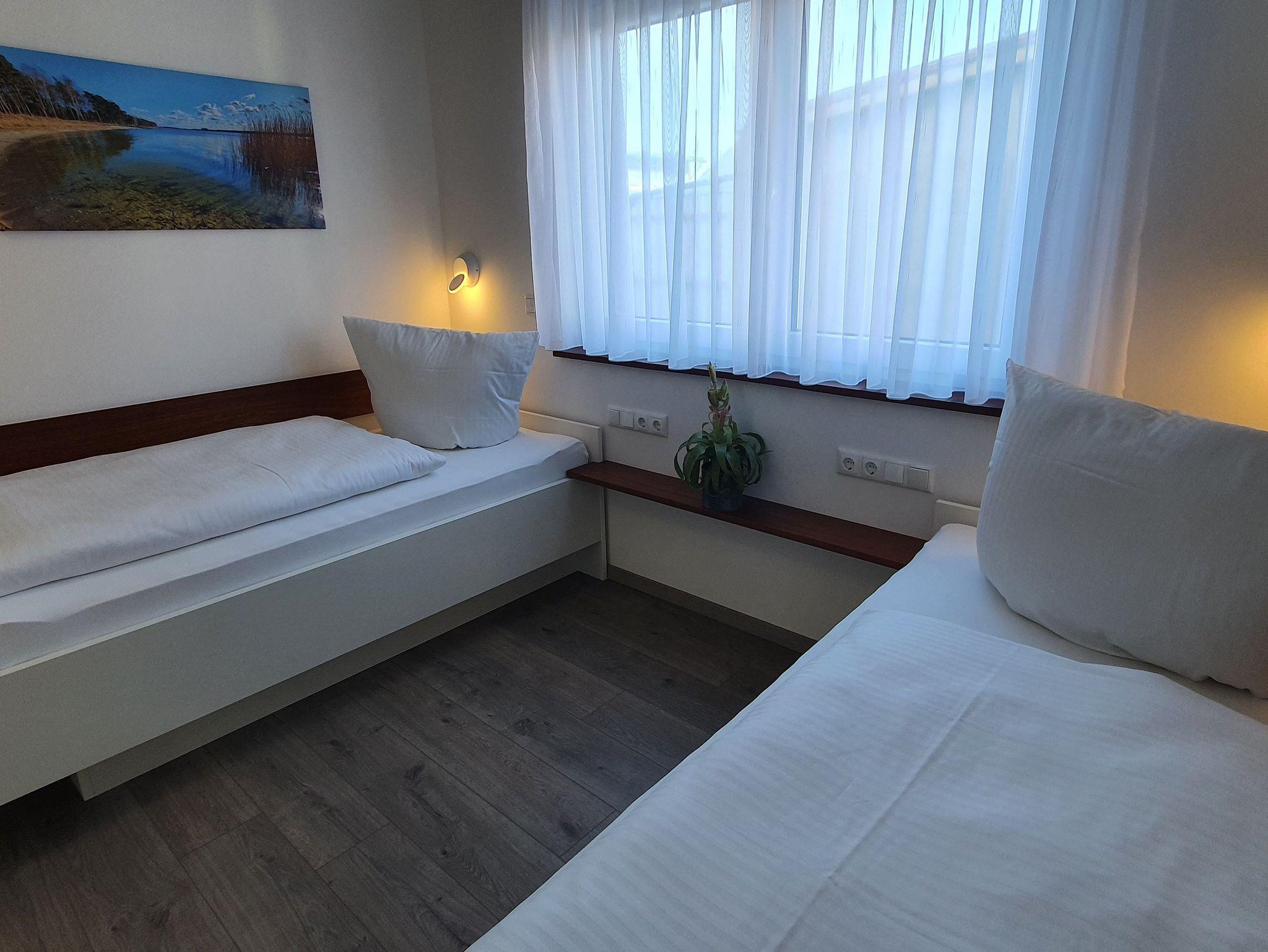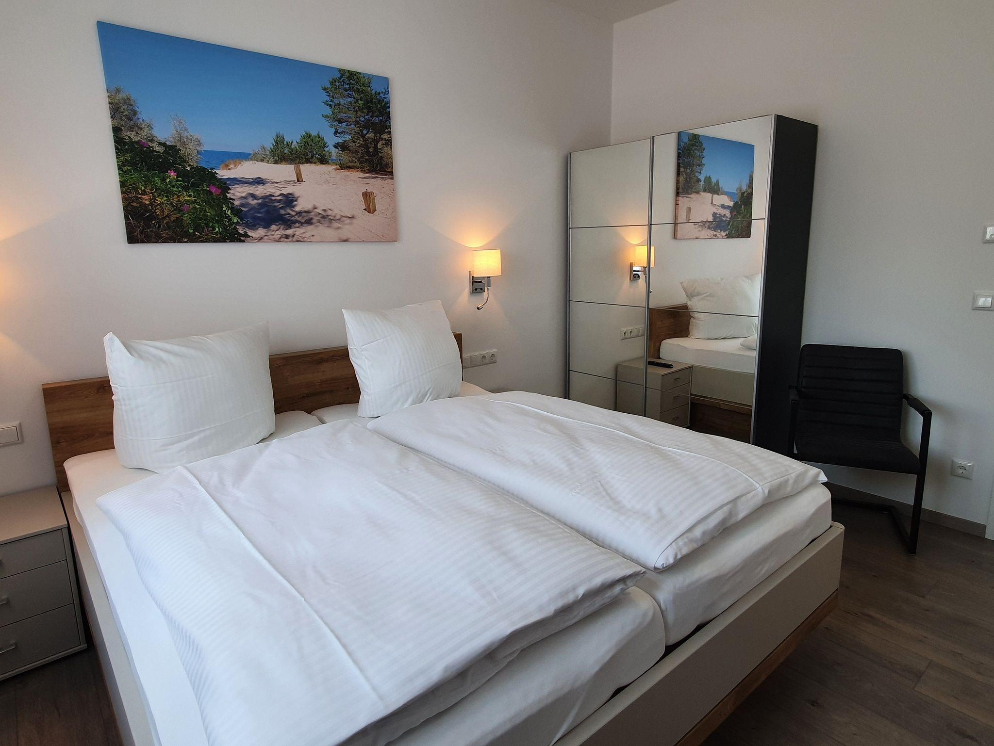 Die Wohnung 2 befindet sich im Erdgeschoss. Diese helle, großzügige Wohnung empfehlen wir gerne Familien oder Urlaubsgästen, die mit mehr als 2 Personen reisen möchten. Für genug Privatsphäre sorgen 2 getrennte Schlafbereiche. Eines der beiden Schlafzimmer ist ganz klassisch mit einem Doppelbett möbliert. Das Andere ist mit 2 getrennt stehenden Betten ausgestattet. Selbstverständlich müssen Sie nicht auf genug Stauraum im Kleiderschrank und beleuchtete Nachttische verzichten. Für Schlafkomfort sorgen verstellbare Lattenroste und hochwertige Federkernmatratzen. In der Wohnung stehen Ihnen ein Badezimmer mit ebenerdiger Dusche sowie ein zusätzliches separates Gäste-WC zur Verfügung.