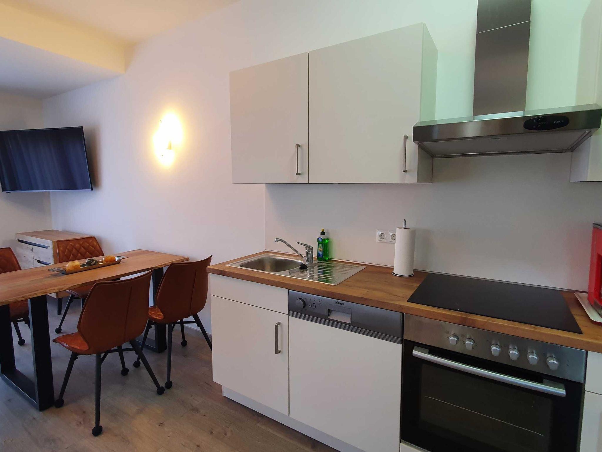 Für Ihren individuellen Aufenthalt bietet ihnen der Essbereich und eine voll ausgestattete Küche mit Spülmaschine, Backofen, geräumigem Kühlschrank, Kochfeld, Kaffeemaschine, Wasserkocher und Toaster alle Freiheiten.