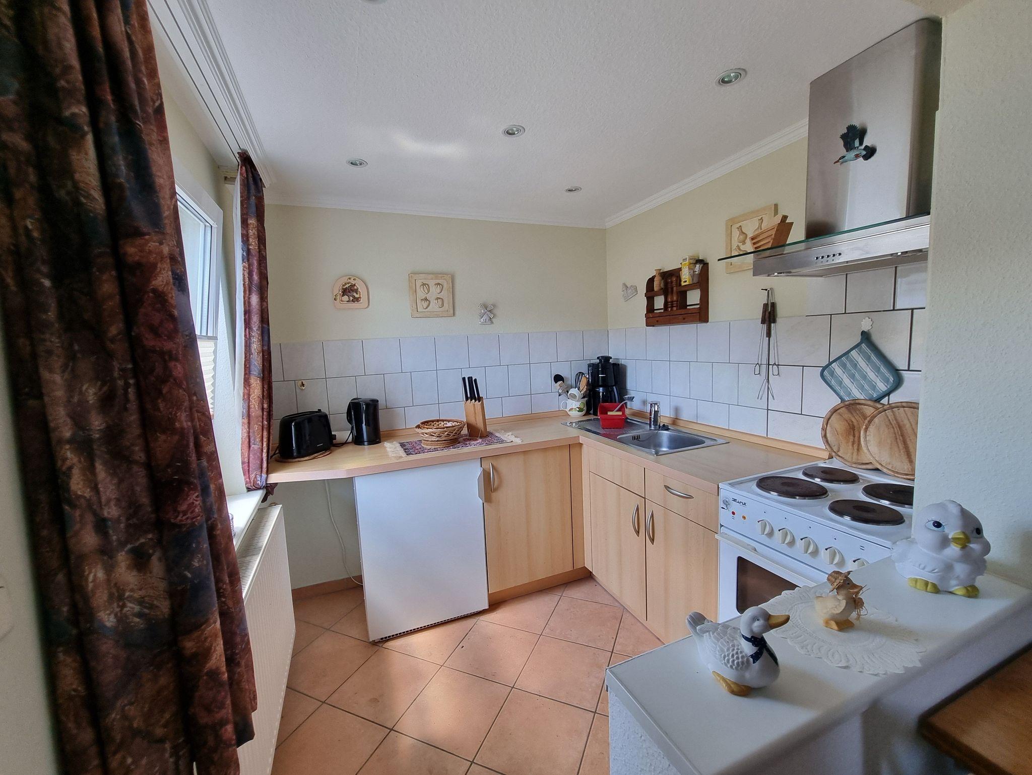 gut ausgestattete Küche mit E-Herd, Backofen, Wasserkocher, Kaffeemaschine, Toaster, Kühlschrank, Eierkocher, Gläser, Geschirr, Besteck, SAT-TV, Radio