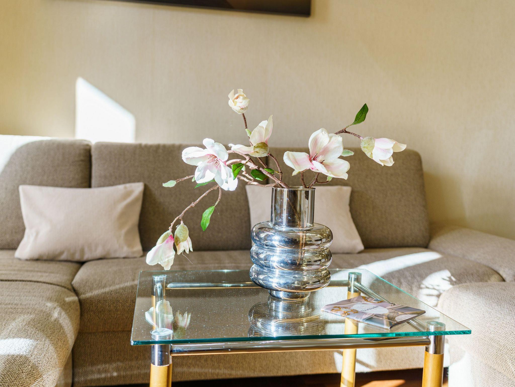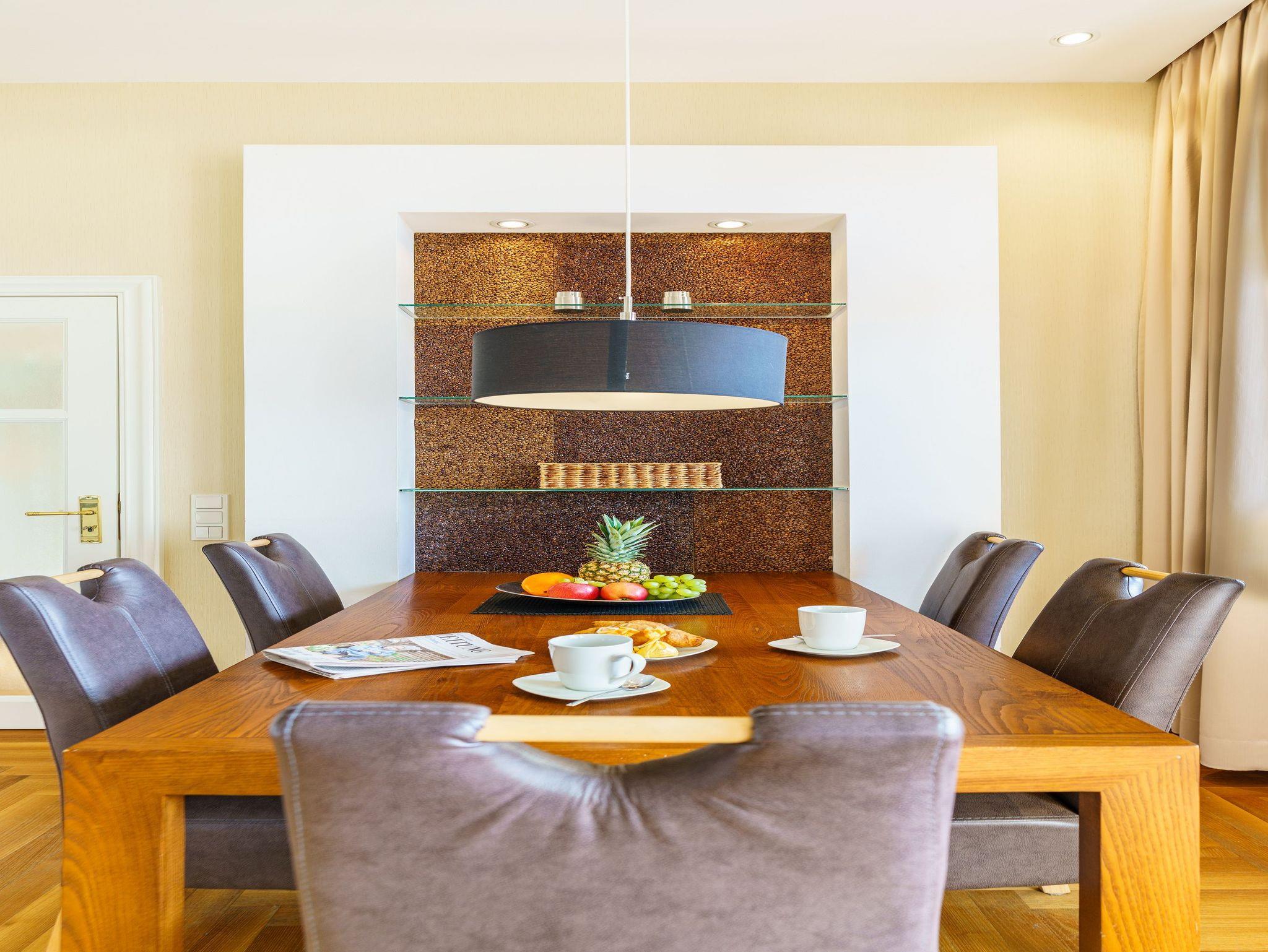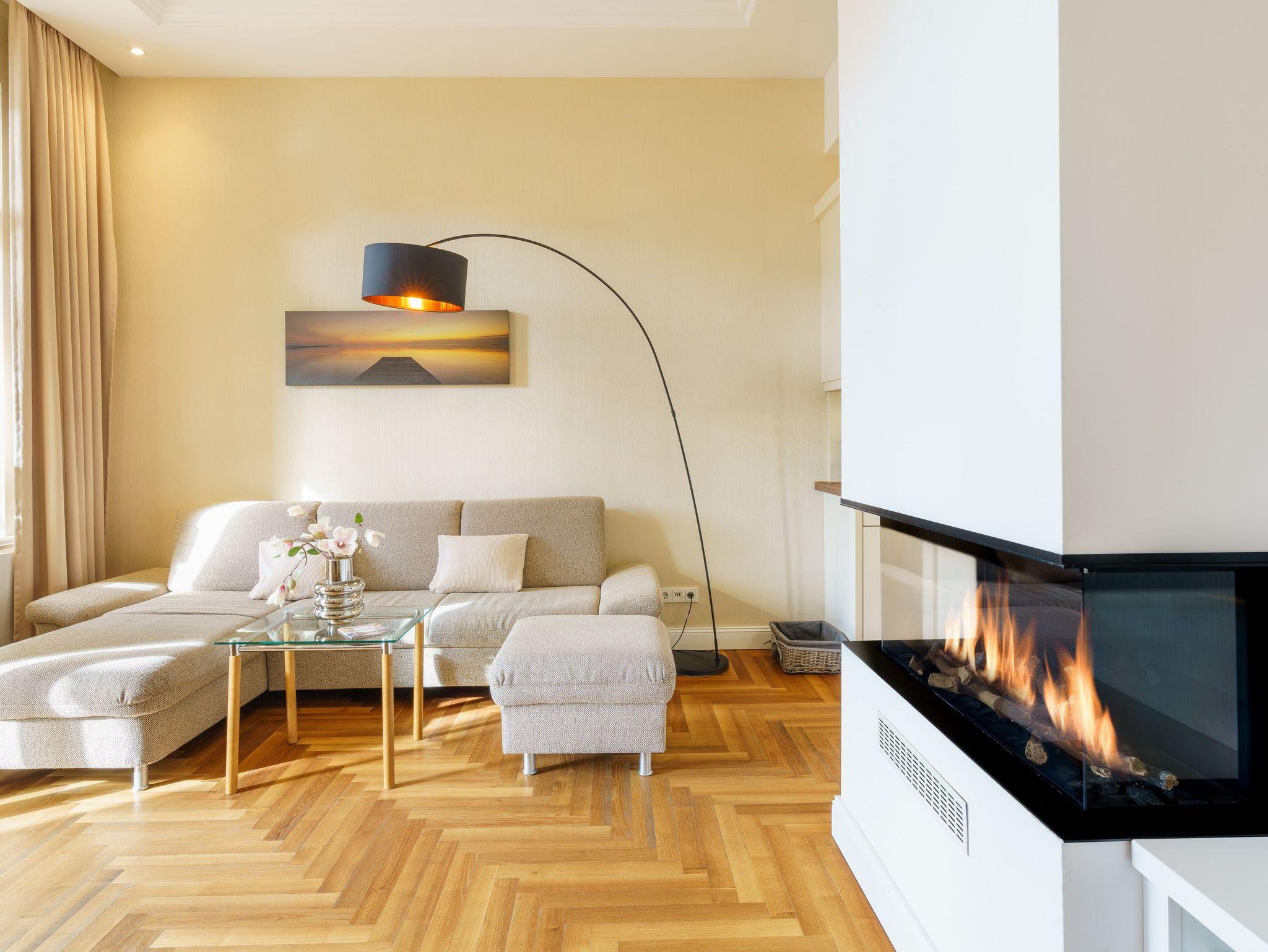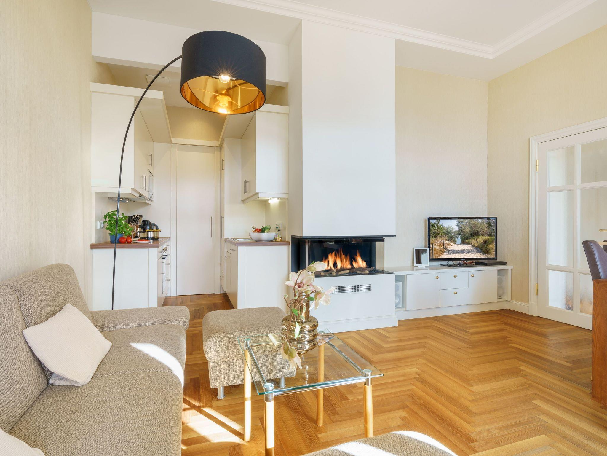 Die Einrichtung des Appartements ist in beigen und braunen Tönen gehalten, wodurch eine gelungene Mischung zwischen Moderne und Historie entsteht. Die gemütliche Polstersitzecke lädt zum Entspannen vor dem Gaskamin ein. Ein Flachbildfernseher sorgt für die unterhaltsamen Stunden zu jeder Jahreszeit.