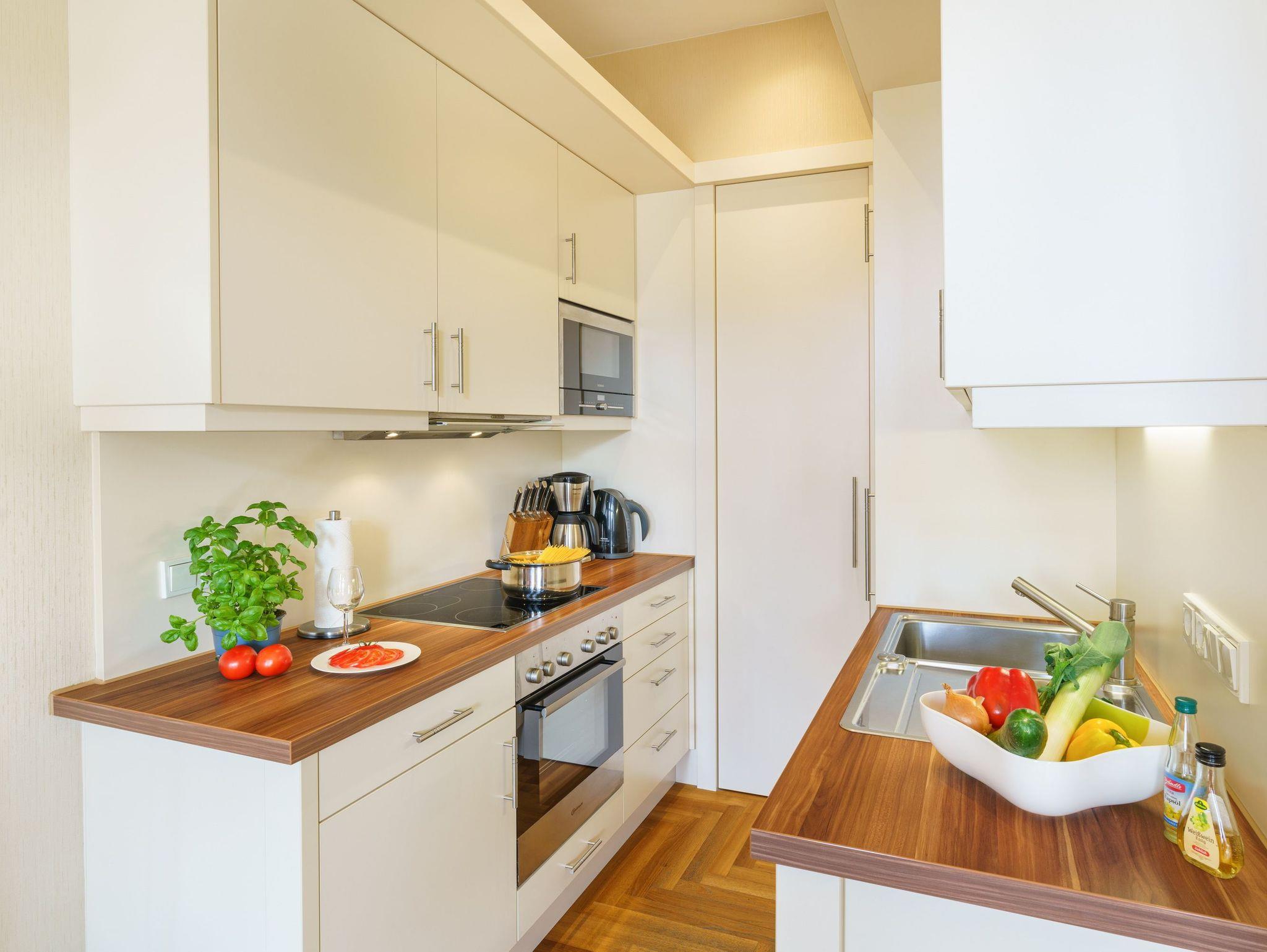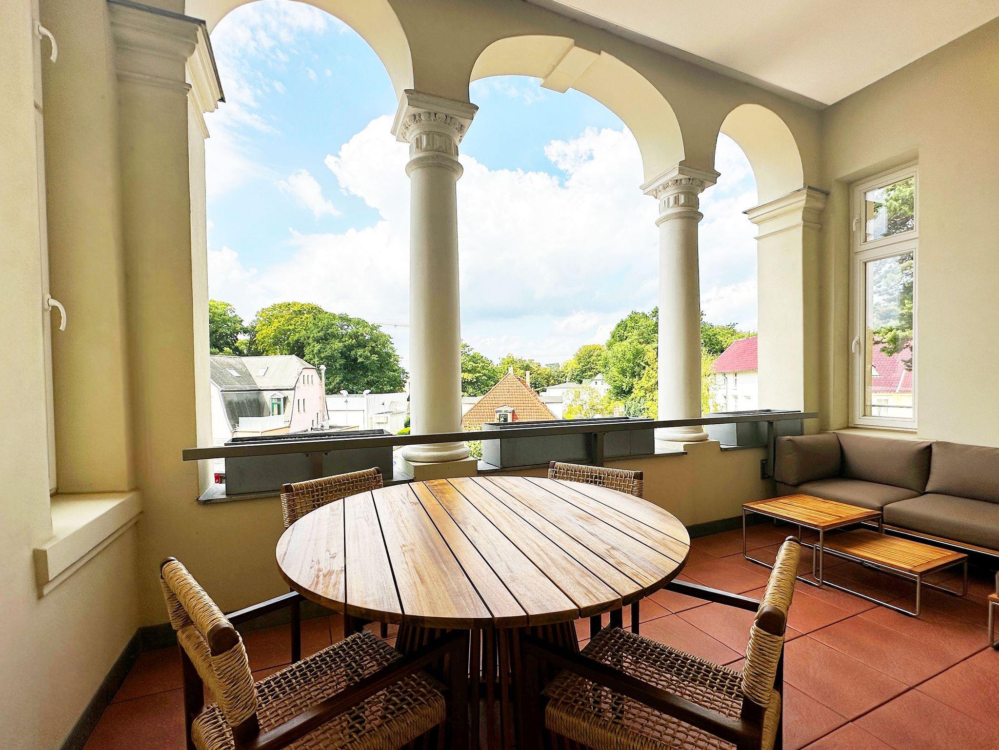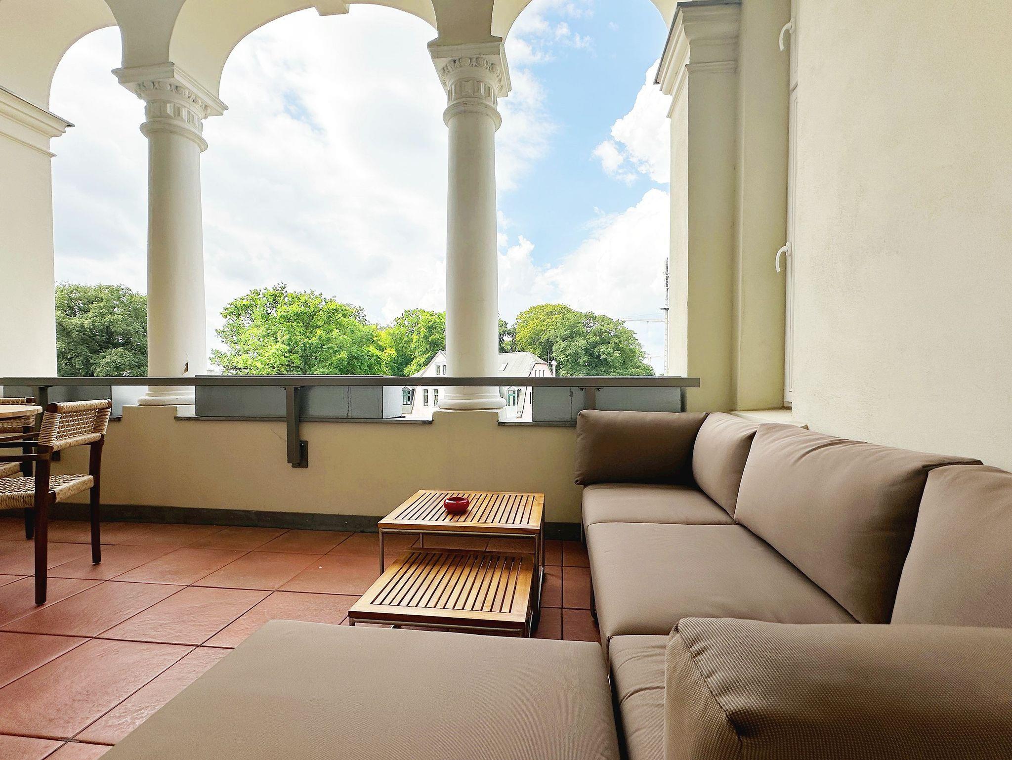 Die im Wohnbereich integrierte Küchenzeile lässt dank Geschirrspüler, Kühlschrank mit Gefrierfach, Backofen, Mikrowelle, Wasserkocher, Toaster, Kaffeemaschine und vielen Extras keine Wünsche offen. Der vom Wohnzimmer abgehende überdachte Nordost-Balkon ist wegen seiner Stuckelemente und Säulen einzigartig. Auf dem Balkon befinden sich exquisite Terrassenmöbel aus Holz von der Firma Sklum. Die jungen Designliebhaber aus Spanien lieben die Nachhaltigkeit, das Reisen und die Natur und legen daher besonderen Wert, dass sich dieses Lebensgefühl in ihren Möbeln und Kunstelementen widerspiegelt. Egal, ob gemütlich am Tisch oder auf dem Sofa - der Erholungseffekt ist hier garantiert.