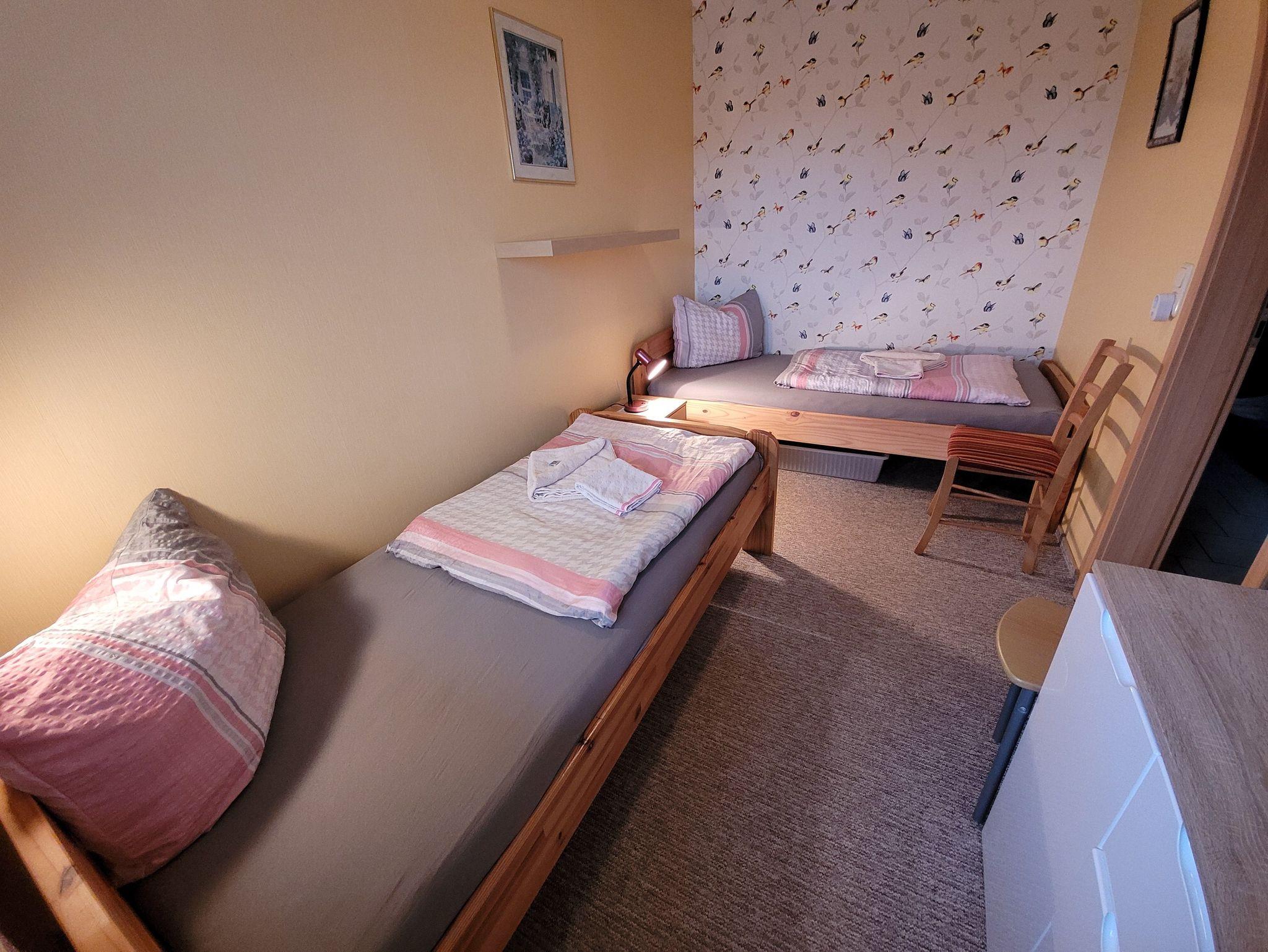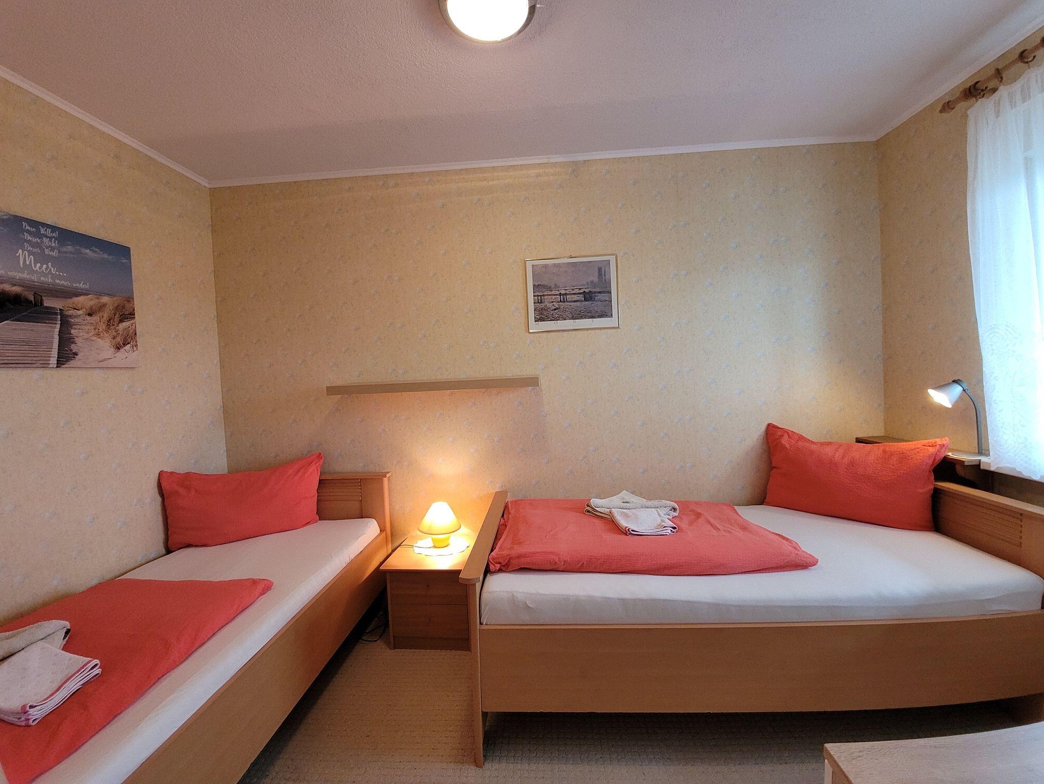 Unser Ferienhaus liegt ca.15 Geh-Minuten vom Strand entfernt in einer ruhigen Wohnlage. Die komplett eingerichtete Ferienwohnung mit Wohnzimmer, zwei Schlafzimmern mit einem Doppelbett und einmal zwei Einzelbetten, Küchenzeile, Dusche, WC, Flur und großem Balkon/Terrasse würde für Sie bereitstehen. Zur Ausstattung gehören weiter Radio, Fernseher, einmalig Bettwäsche und Handtücher. In der Küchenzeile sind Mikrowelle, Kaffeemaschine und Toaster, Eier-und Wasserkocher sowie ein 2-Platten-Kocher, Kühlschrank und Geschirr vorhanden. Eine Aufbettung ist im Wohnzimmer nach Absprache auf dem ausziehbarem Sofa möglich.