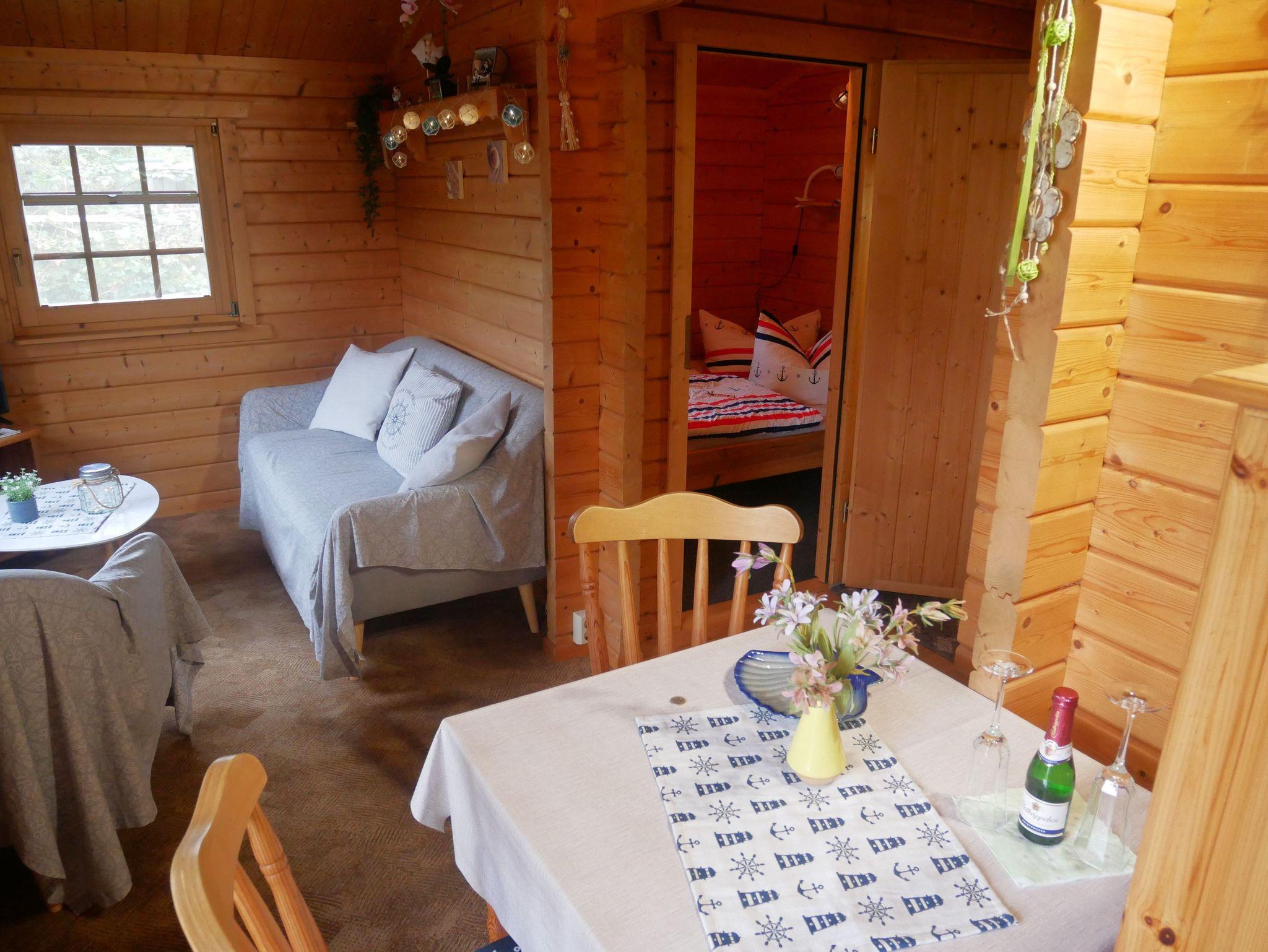 Der gemütliche 24qm große 2-Raum-Bungalow verfügt über einen Wohn-Essbereich mit gemütlicher Couch, Flachbild-TV, Radio, Esstisch und einer offenen Pantry-Küche mit 2-Platten-Cerankochfeld, Spüle, Kühlschrank, Kaffeemaschine, Wasserkocher, Eierkocher und Toaster.
