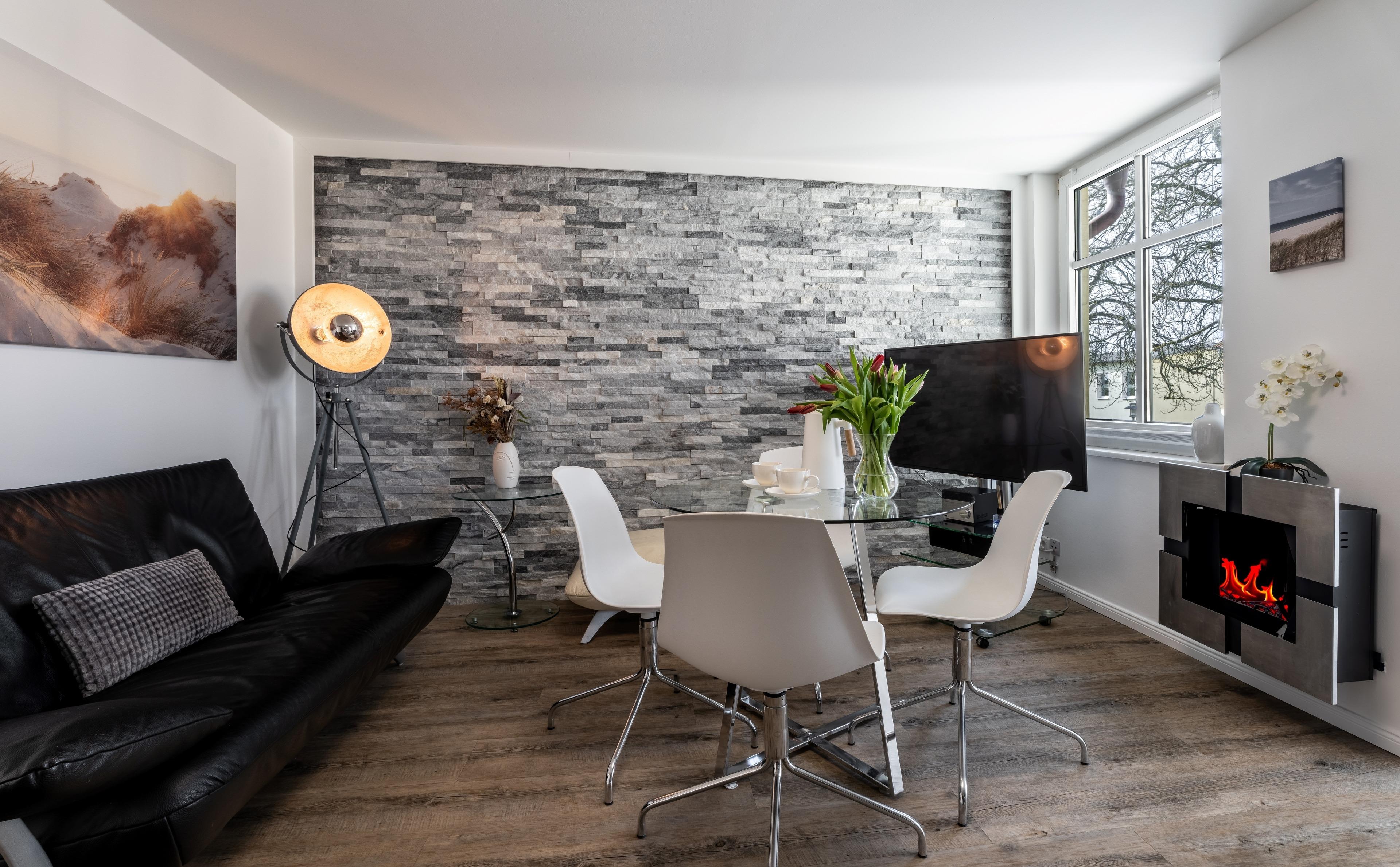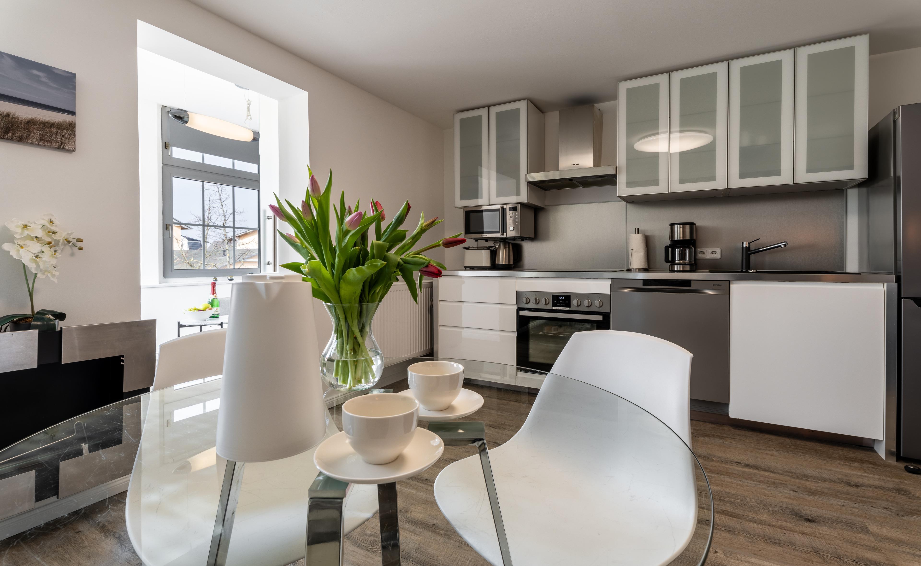 Erleben Sie modernen Komfort in gemütlicher Atmosphäre in unserer 42 qm großen Ferienwohnung Nachtstern im Obergeschoss der liebevoll sanierten Villa Helga. Das Wohnzimmer bietet eine moderne Einbauküche mit Geschirrspüler, großer Kühl- und Gefrierkombination, Backofen mit Induktions-Kochfeld, Mikrowelle, Wasserkocher, Kaffeemaschine und Toaster.