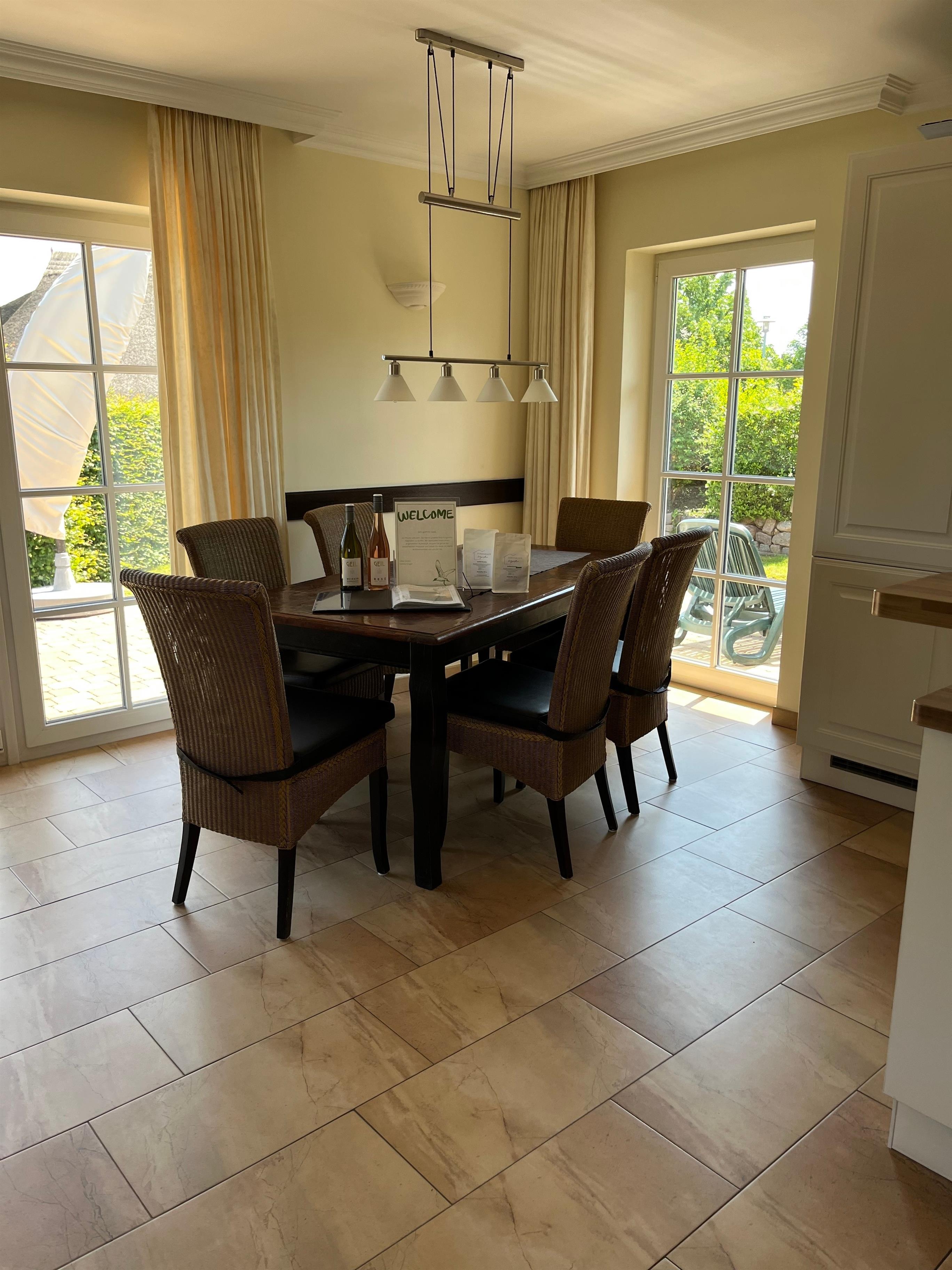 Die Sauna befindet sich im Erdgeschoss, angeschlossen ist eine ebenerdige komfortable Dusche/Schwalldusche . Unsere komplett ausgestattete Küche mit Bartresen und direktem Zugang zu den 2 Terrassen ist zum Wohn-und Essbereich offen. Die gemütliche Sitzgarnitur im Wohnbereich garantiert am großen Kachelkamin bei einem Glas Wein einen entspannten Abend. Der 42 LED-TV Fernseher lädt zu einem entspannten Kinoabend ein. Das Ferienhaus ist komplett mit einer Fußbodenheizung aus Erdwärme ausgestattet. Auf Nachhaltigkeit wird geachtet. Jeder Raum ist wärmemäßig verschieden einzustellen. Auf der großen Terrasse befindet sich eine große Sitzgarnitur für 6 Personen, ein Ampel-Sonnenschirm von Sun Garden, 4 Sonnenliegen und ein Strandkorb.