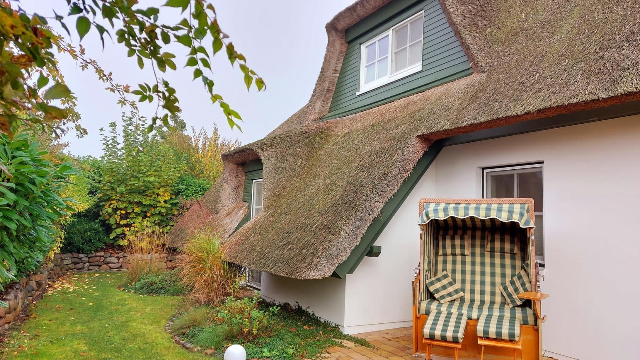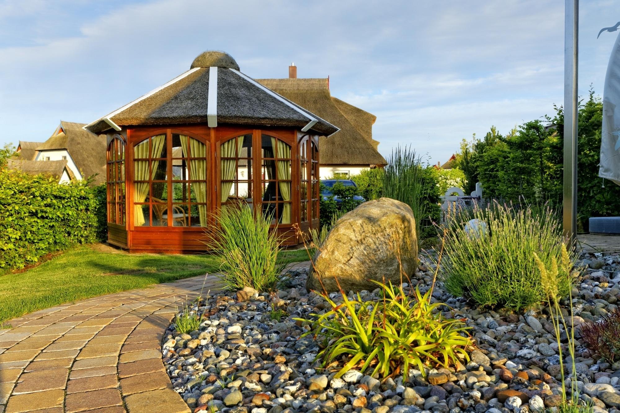 Ein sehr ansprechender zum Haus passender möblierter beleuchteter großer reetgedeckter Pavillon im Garten gibt Ihnen jederzeit Rückzugsmöglichkeiten oder manchmal Schutz vor dem Wind.