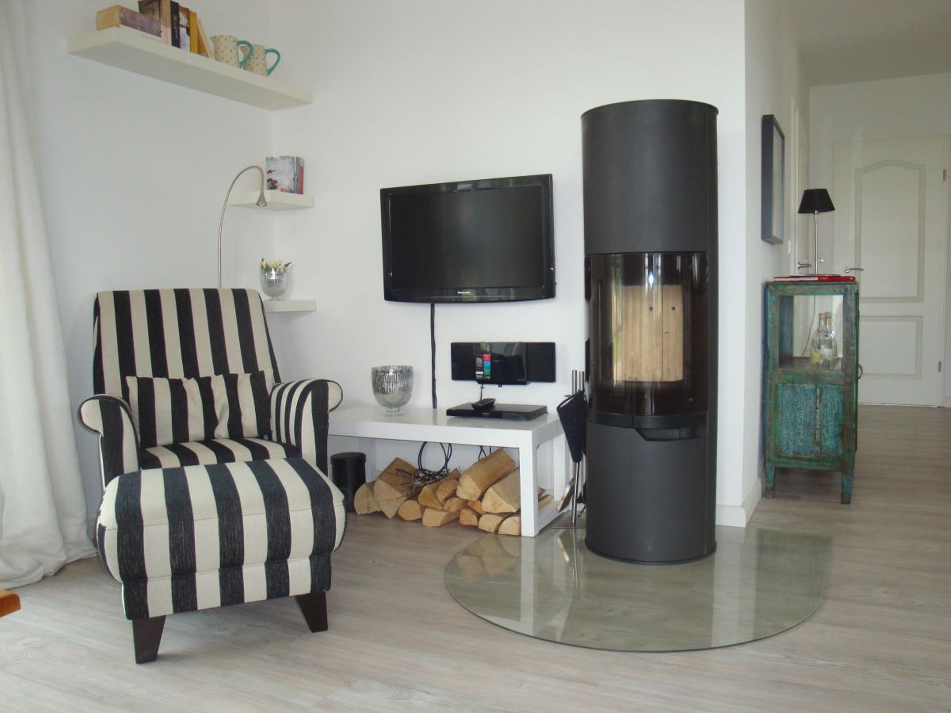 Jeder Raum ist mit einem Flachbildschirm und gemütlichen Sitzgelegenheiten ausgestattet. Das "Gartenzimmer" im Erdgeschoss hat einen direkten Zugang zu Garten und Terrasse. Für gesellige Grillabende steht ein Weber-Elektrogrill für Sie bereit. Das Familienzimmer im Obergeschoss verfügt über einen großen Balkon mit Blick auf das Achterwasser, einen Ohrensessel zum relaxen, einen kleinen Schreibtisch und einem Kinderbettchen, das Schlafzimmer daneben verfügt über zwei Einzellbetten, die auch zusammen gestellt werden können.