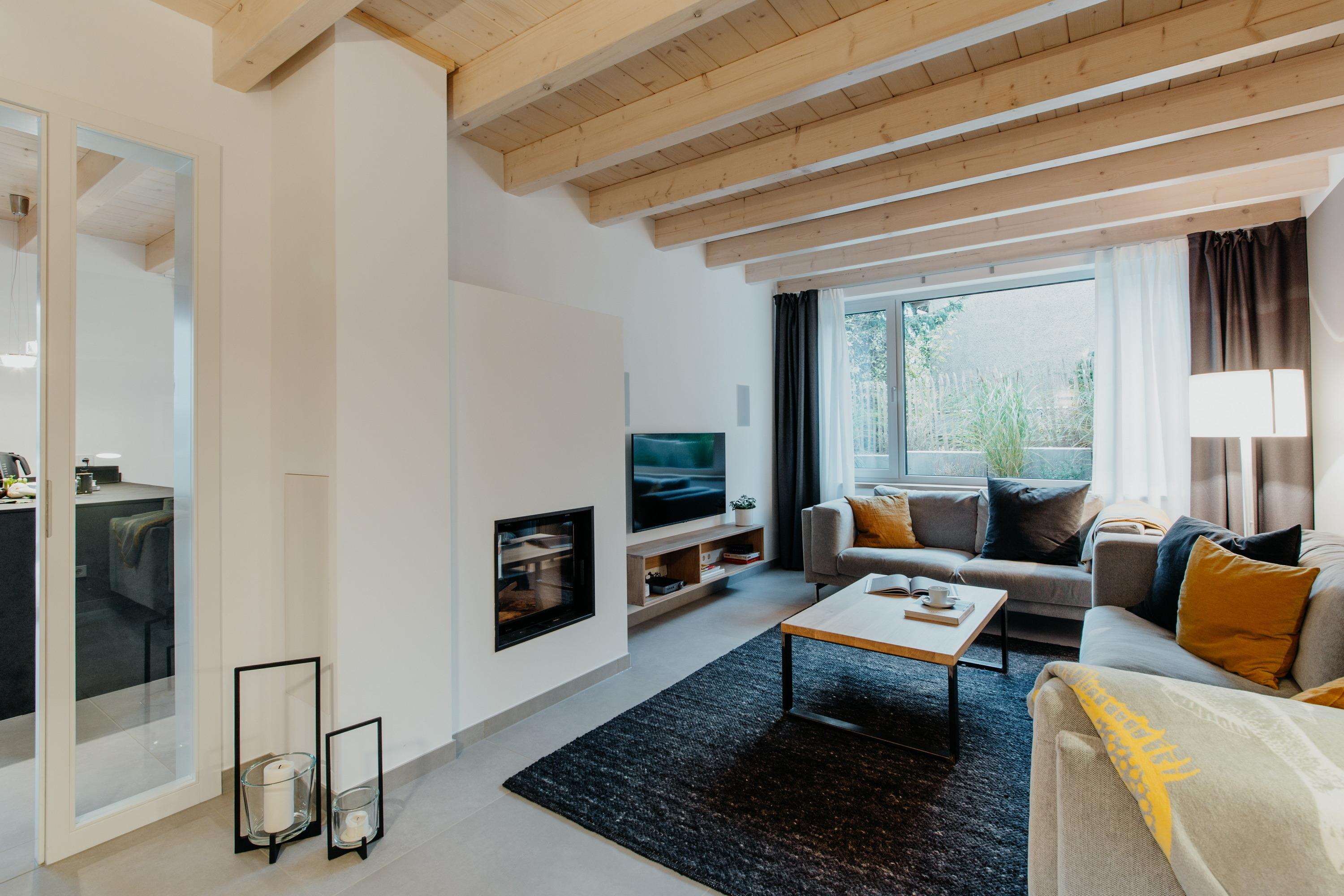 Im Erdgeschoss befinden sich die Küche, der Essbereich, das Wohnzimmer sowie das Wellnessbad mit Sauna, Wellnessbadewanne mit Skin Touch und Dusche. Vom Essbereich gelangen Sie direkt auf die überdachte Terrasse und in den dazugehörigen Garten.