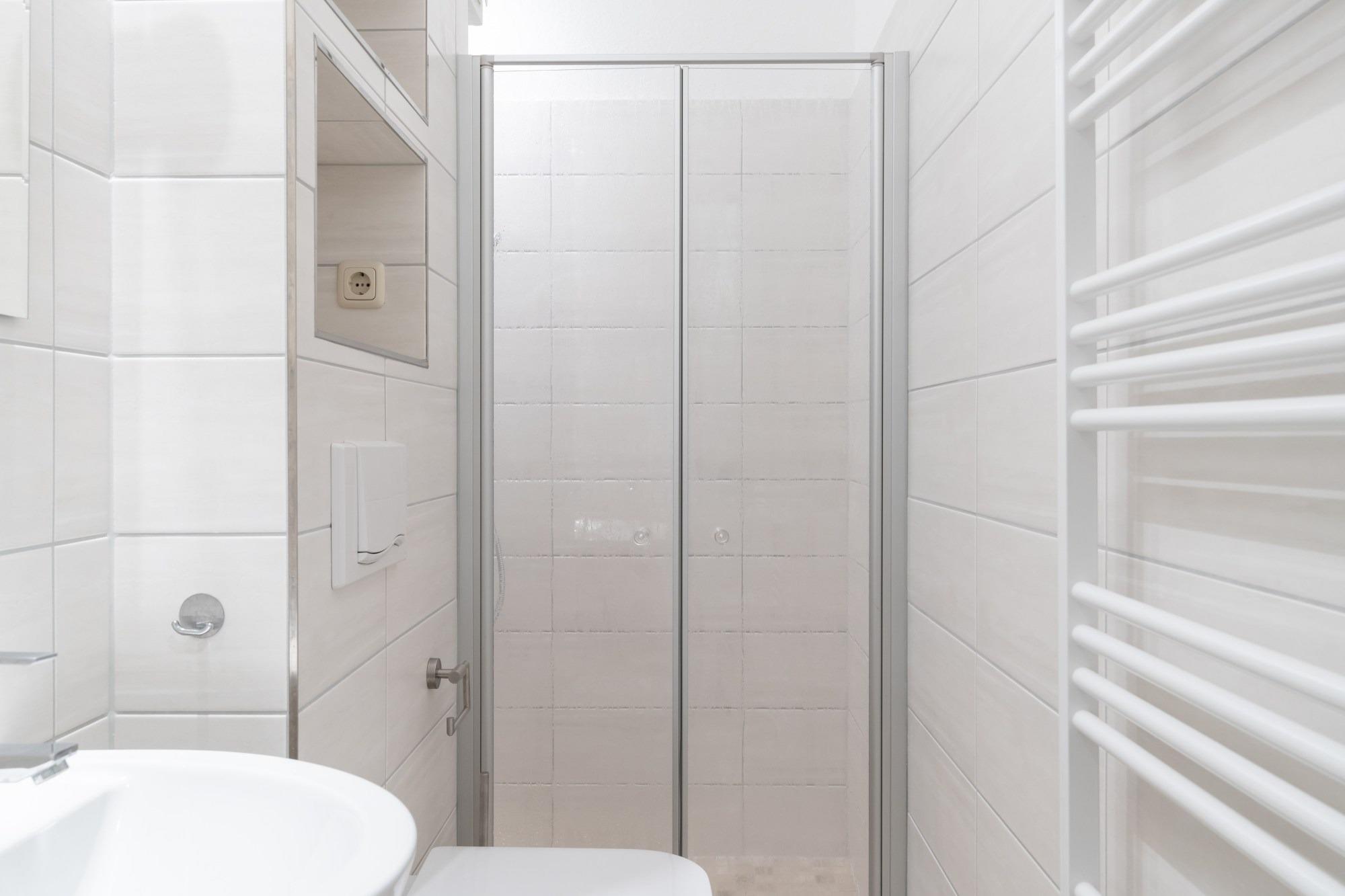 Das Badezimmer verfügt über eine Dusche (ebenerdig) und WC.
