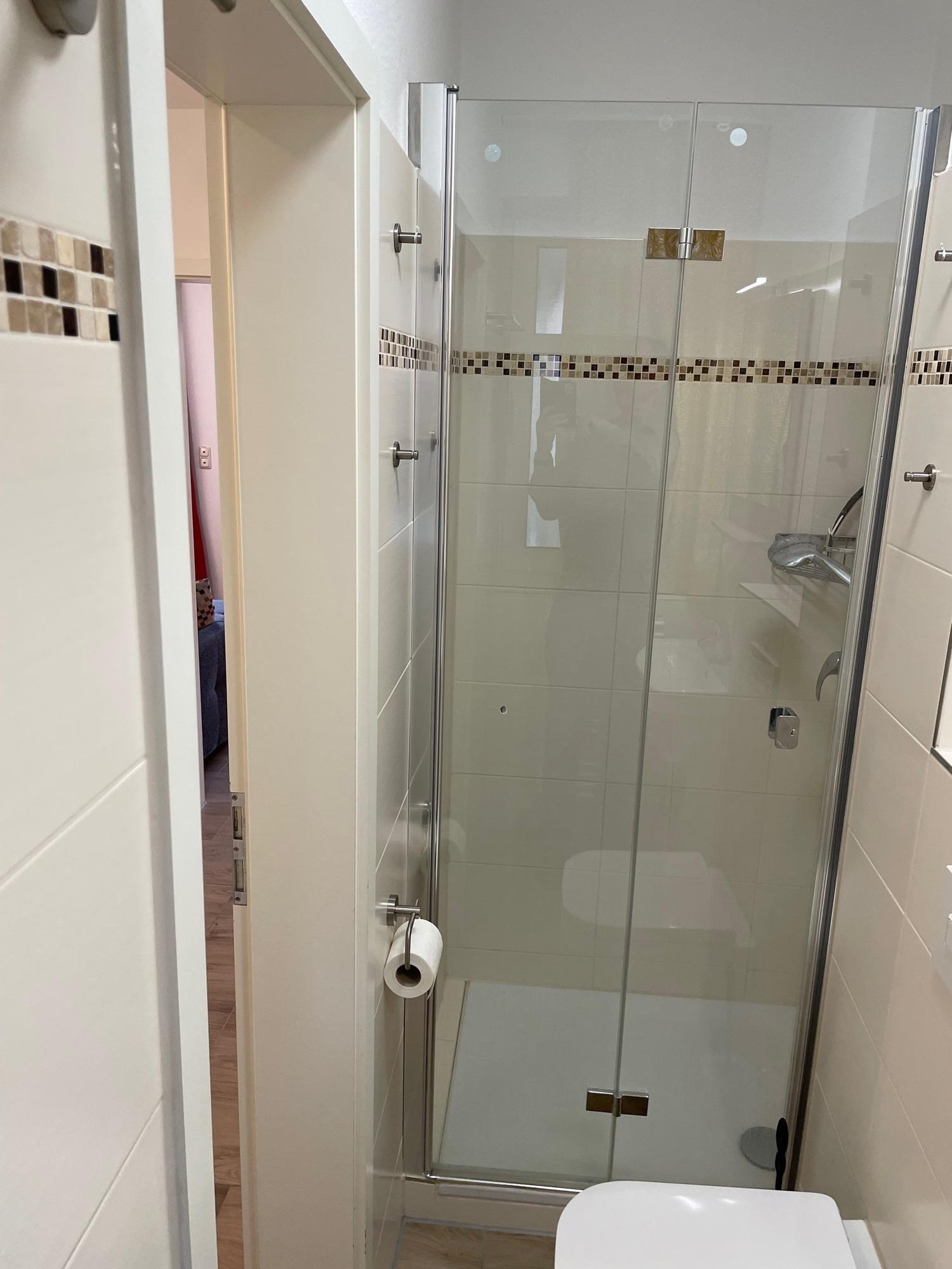 Das Badezimmer verfügt über eine Dusche und WC.