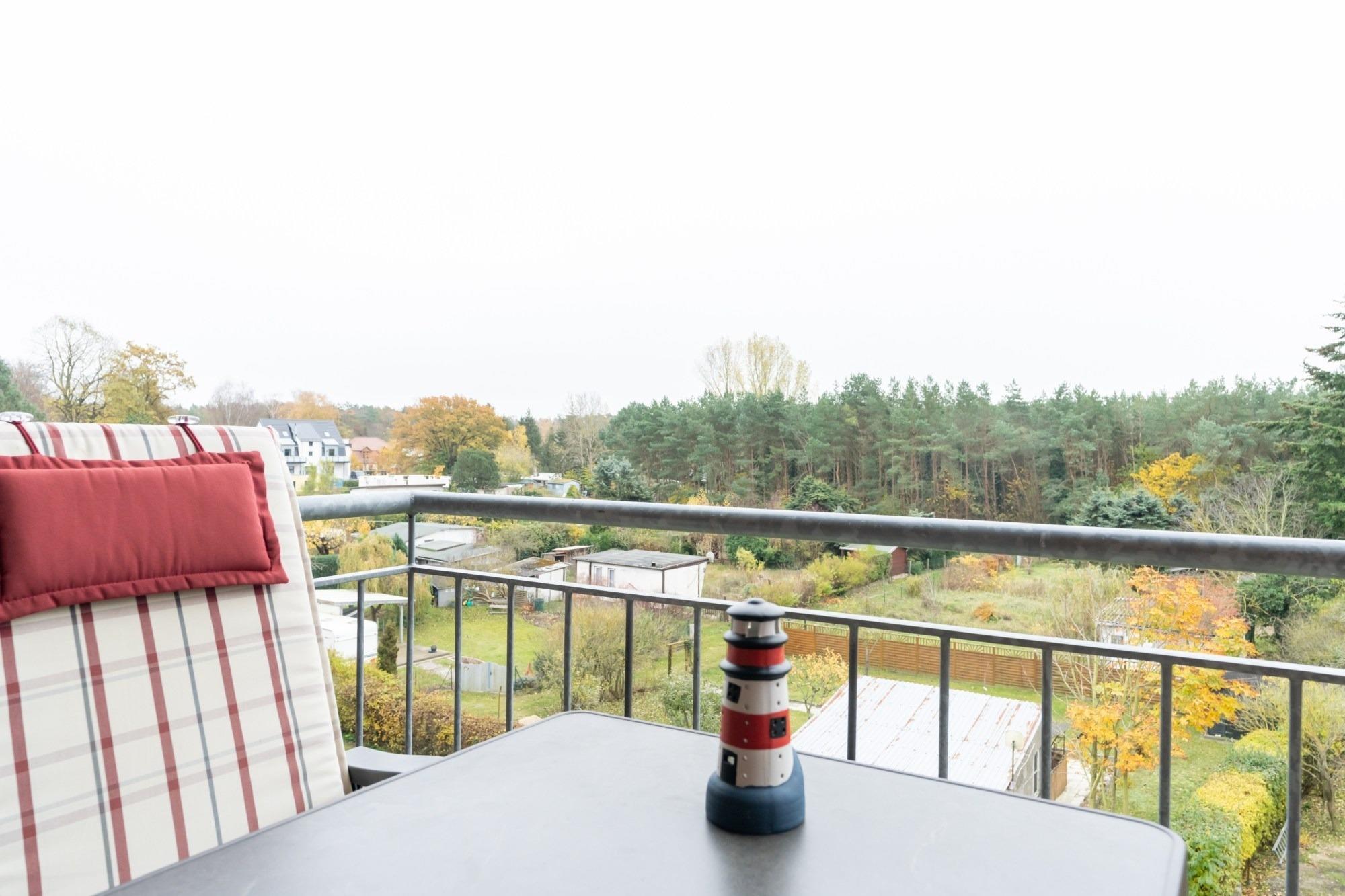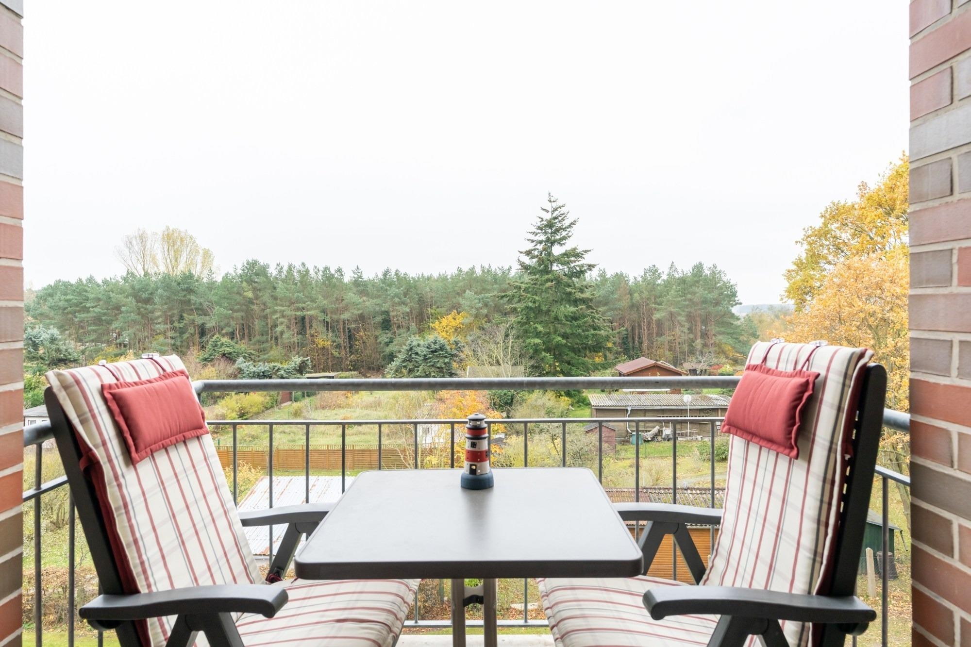 Lassen Sie den Abend nach einem erlebnisreichen Tag gemütlich auf dem Südbalkon ausklingen und genießen Sie den freien Blick auf das Achterwasser.
