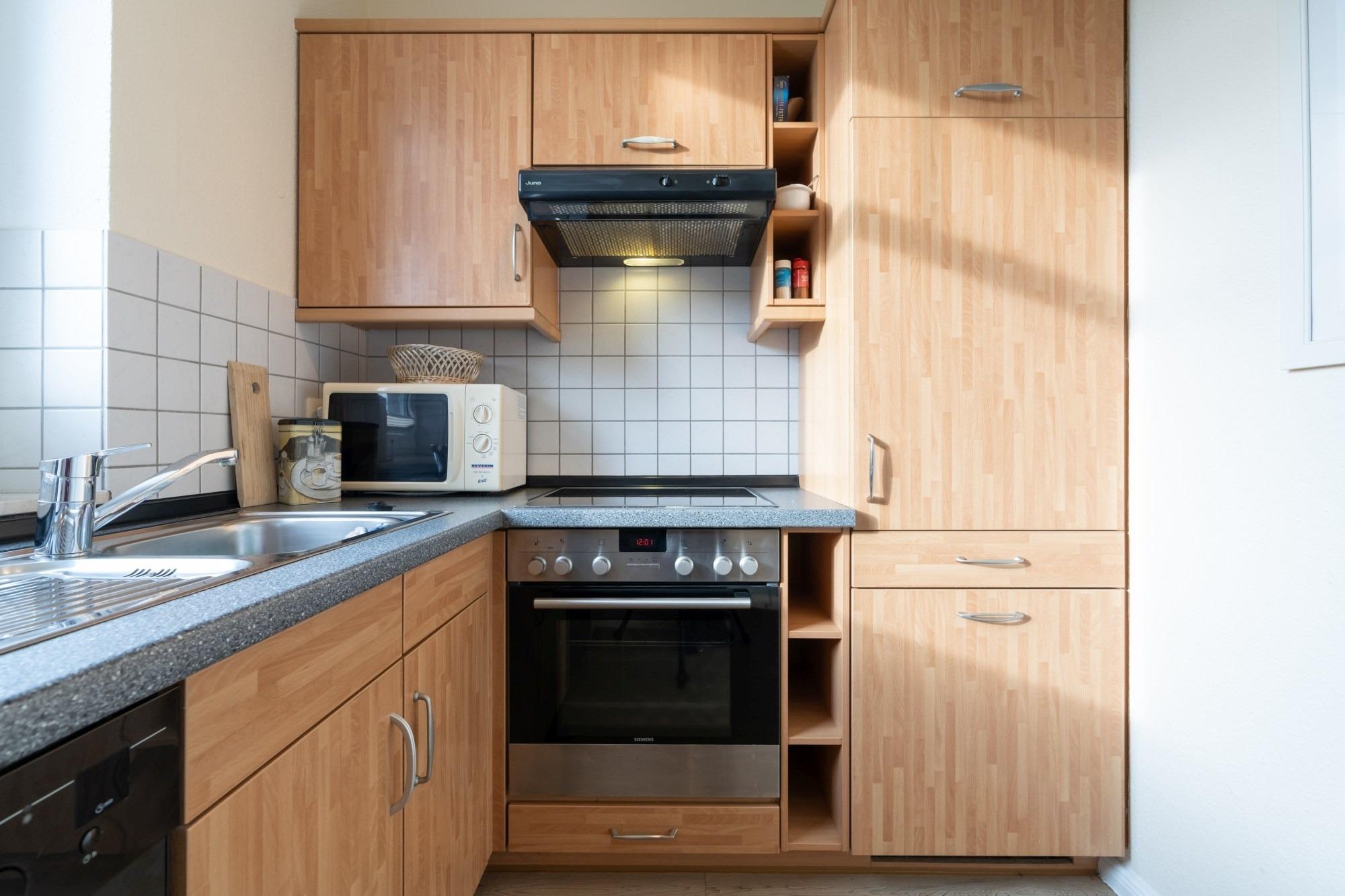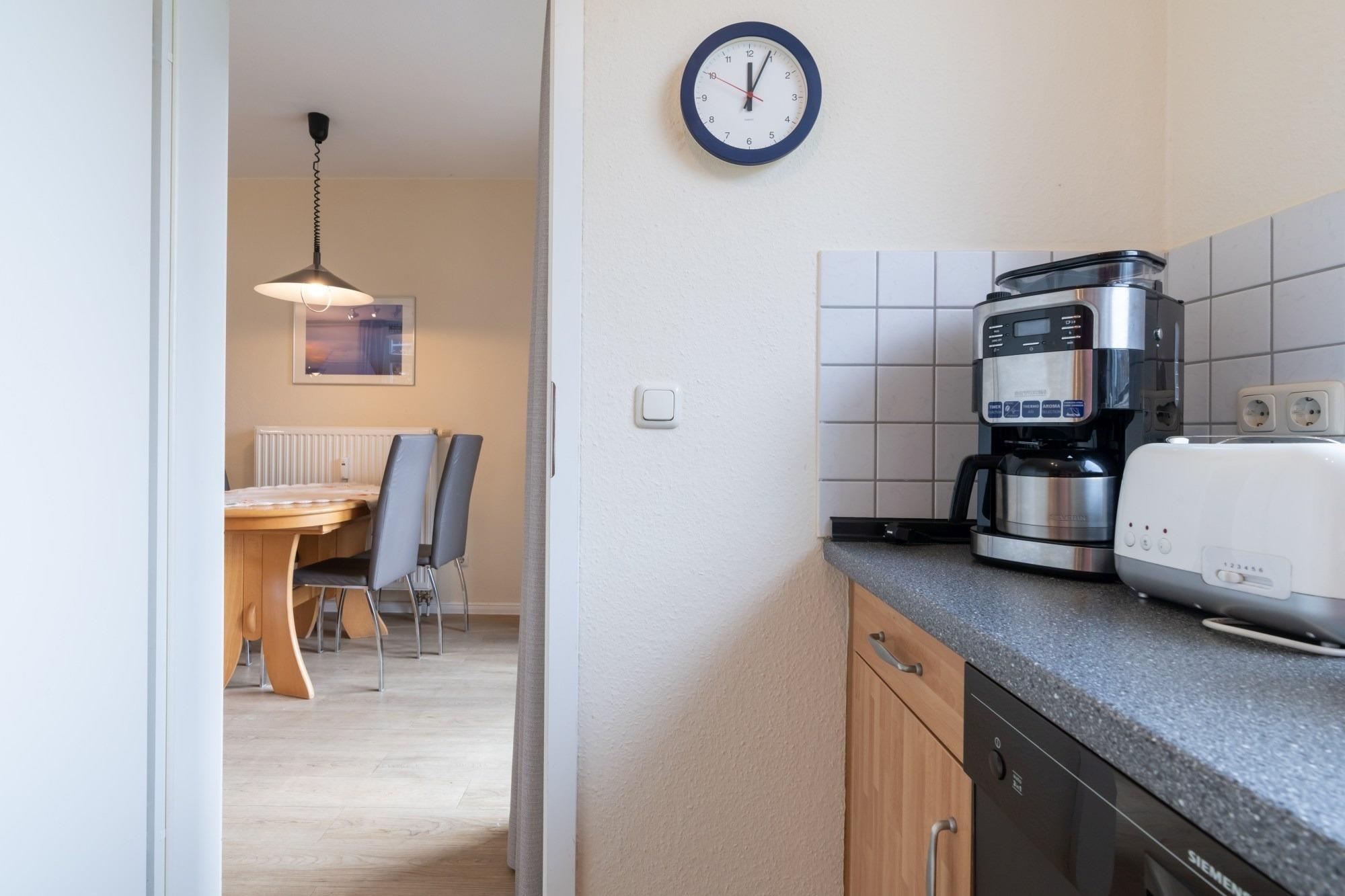 Die hier angrenzende Küchenzeile ist mit einem Kühlschrank mit Gefrierfach, einem Geschirrspüler und einem Backofen mit Kochfeld ausgestattet. Eine Kaffeemaschine, ein Toaster und ein Wasserkocher stehen Ihnen hier selbstverständlich zur Verfügung.