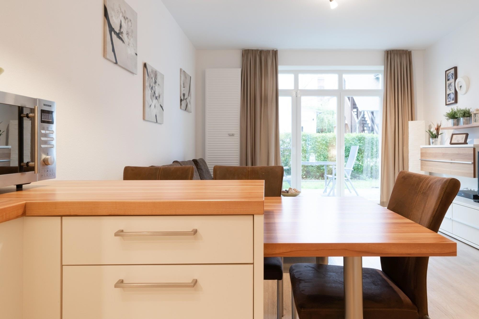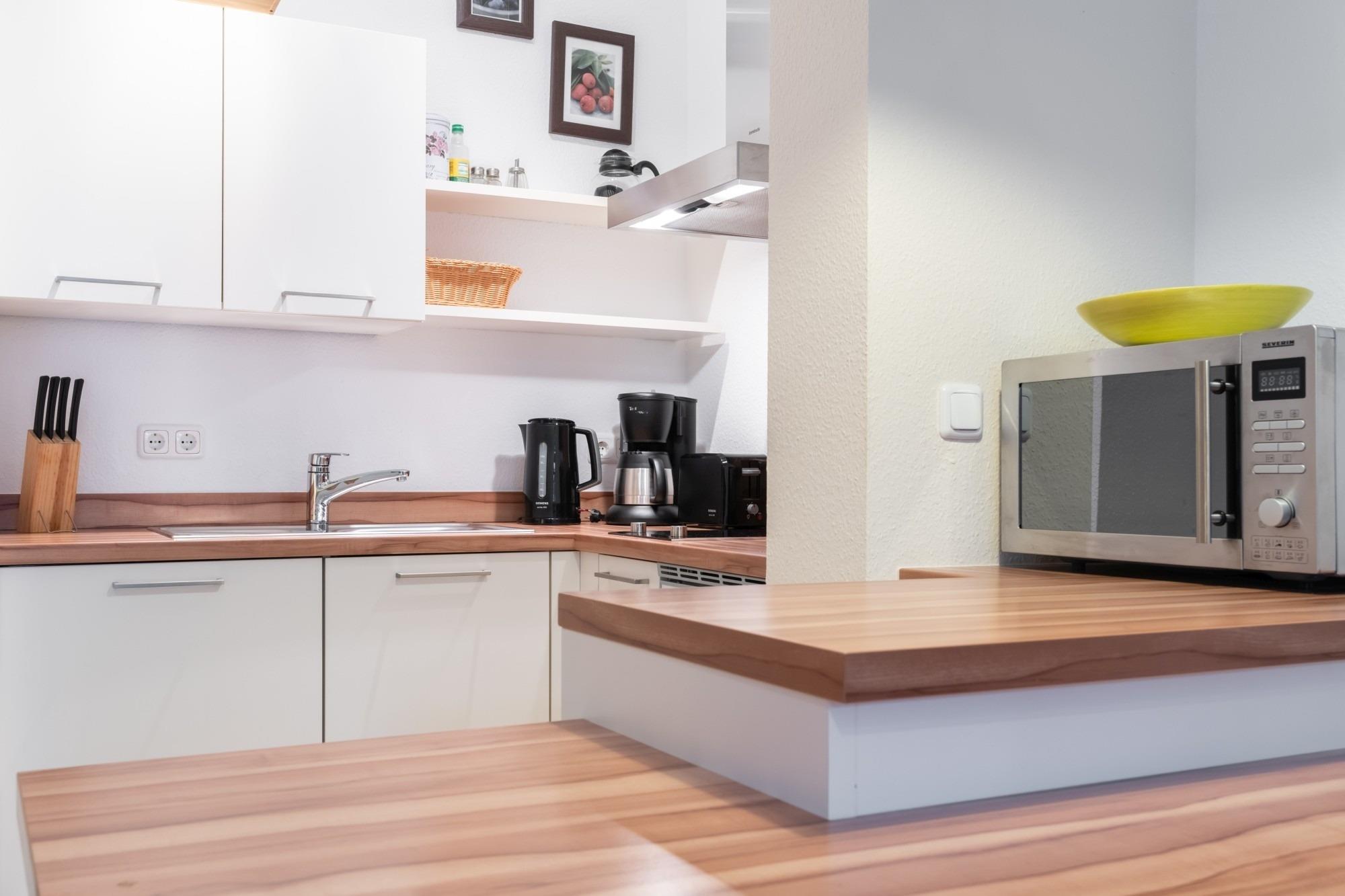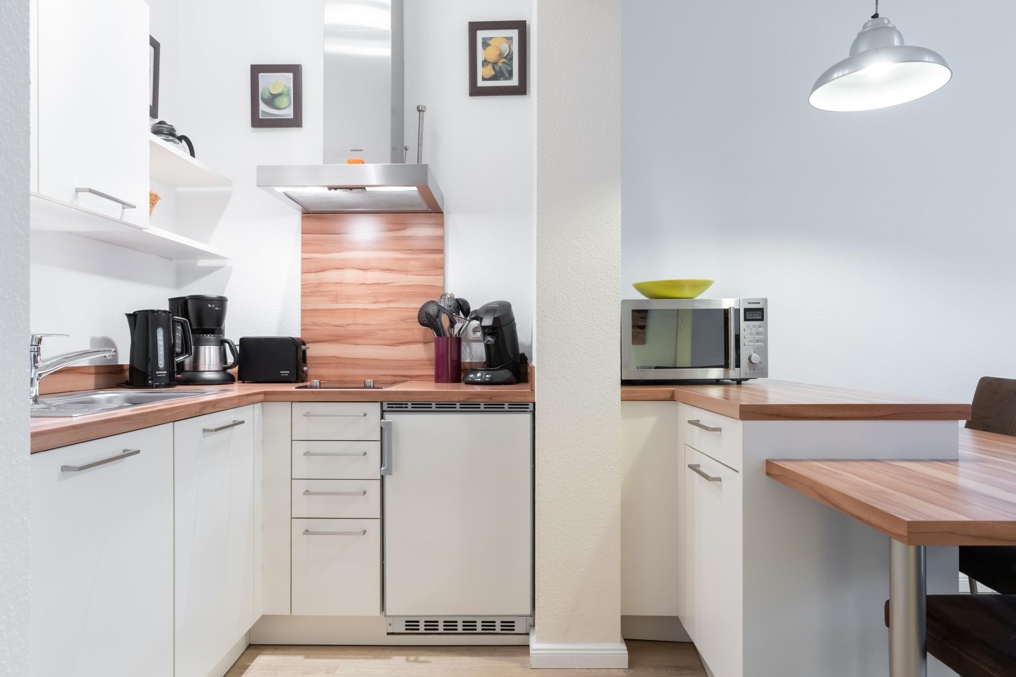 Die hier angrenzende Küchenzeile ist mit einem Kühlschrank mit Gefrierfach, einem Geschirrspüler, einer Mikrowelle mit Backofenfunktion und einem Cerankochfeld ausgestattet. Eine Kaffeemaschine, ein Toaster und ein Wasserkocher stehen Ihnen hier selbstverständlich zur Verfügung.