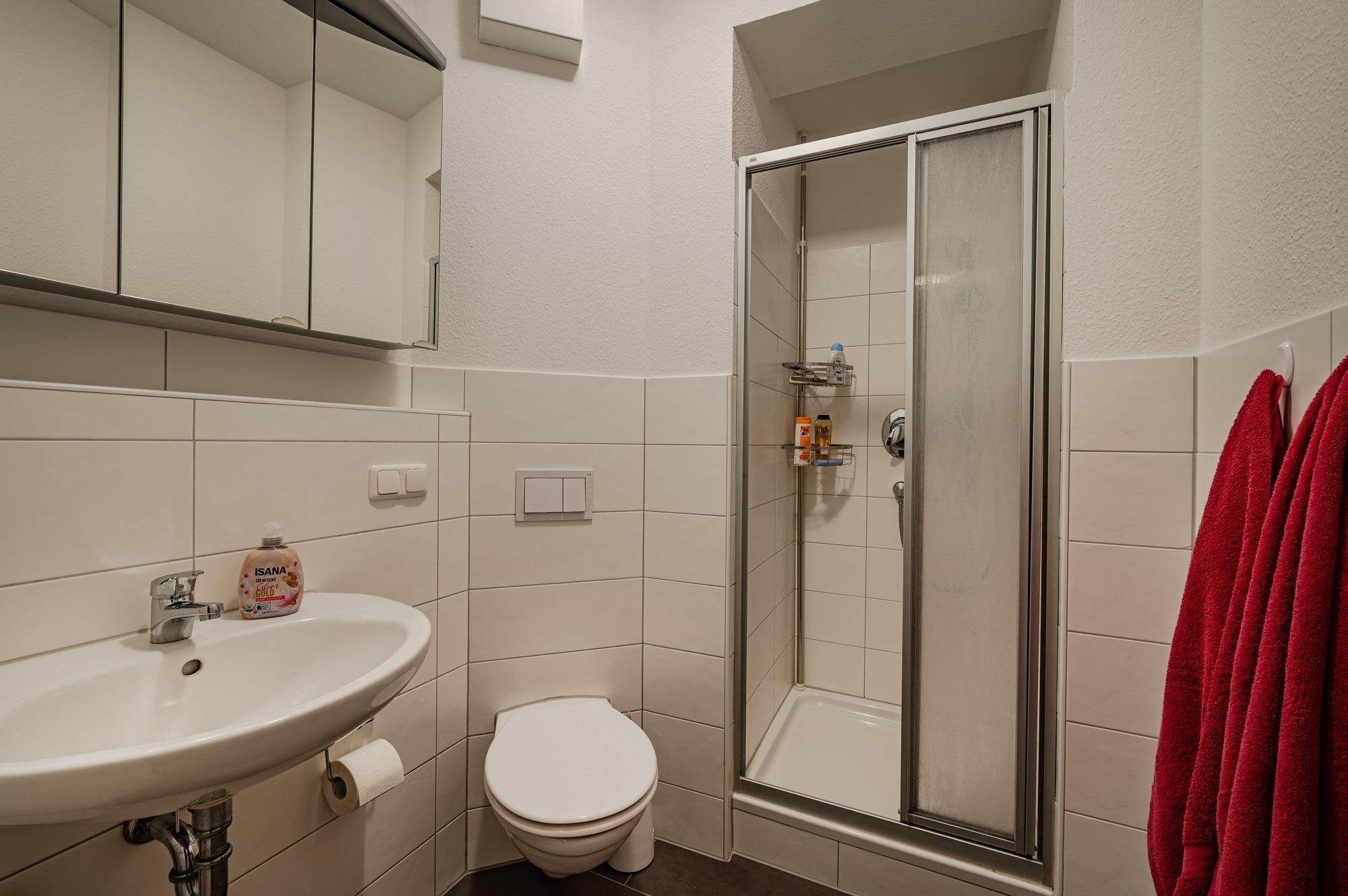 Das Badezimmer verfügt über eine Dusche (mit Duschwanne) und WC.