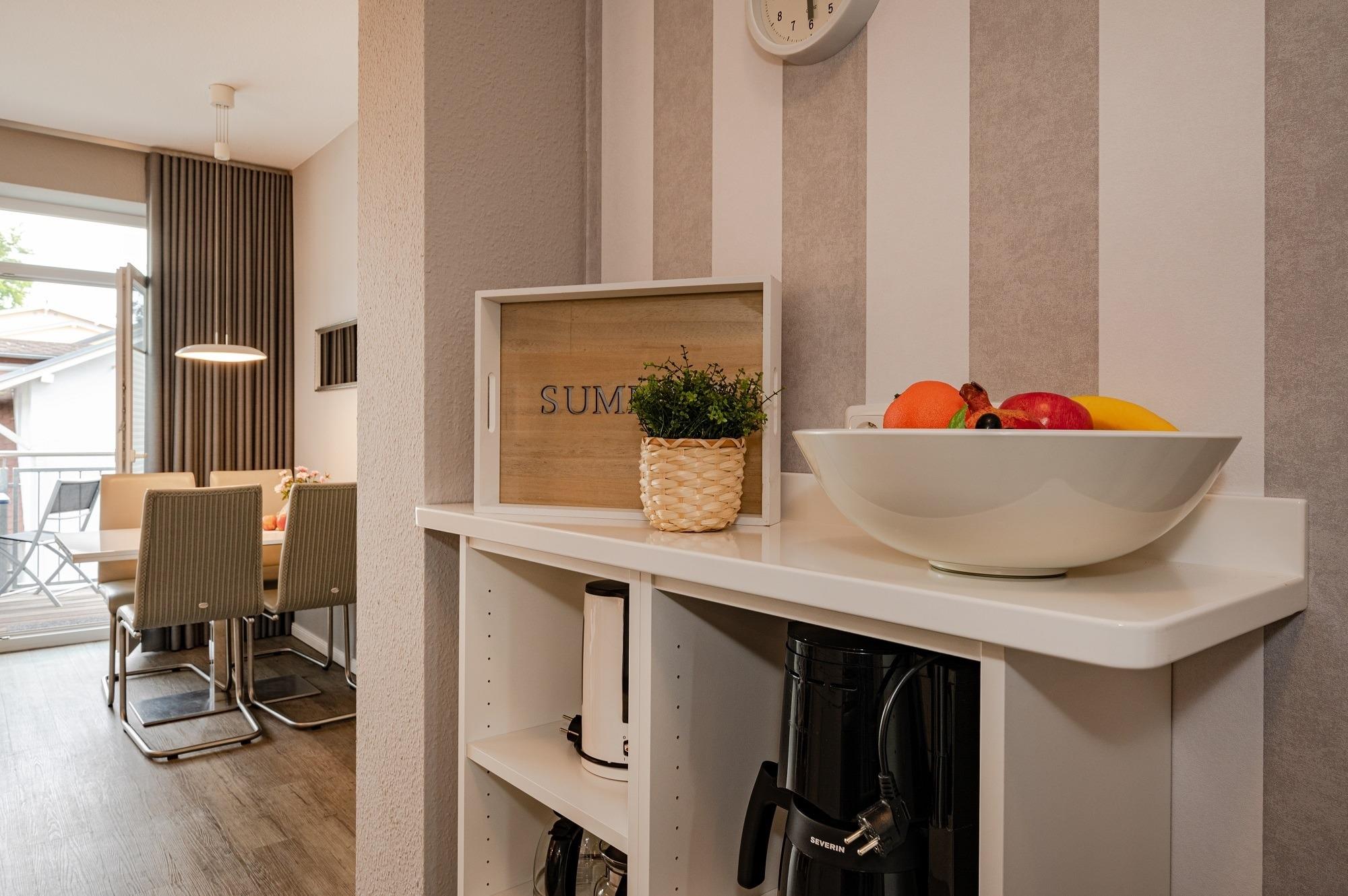 Die hier angrenzende Küchenzeile ist mit einem Kühlschrank mit Gefrierfach, einem Geschirrspüler und einem Backofen mit Cerankochfeld ausgestattet. Eine Kaffeemaschine, ein Toaster und ein Wasserkocher stehen Ihnen hier selbstverständlich zur Verfügung.