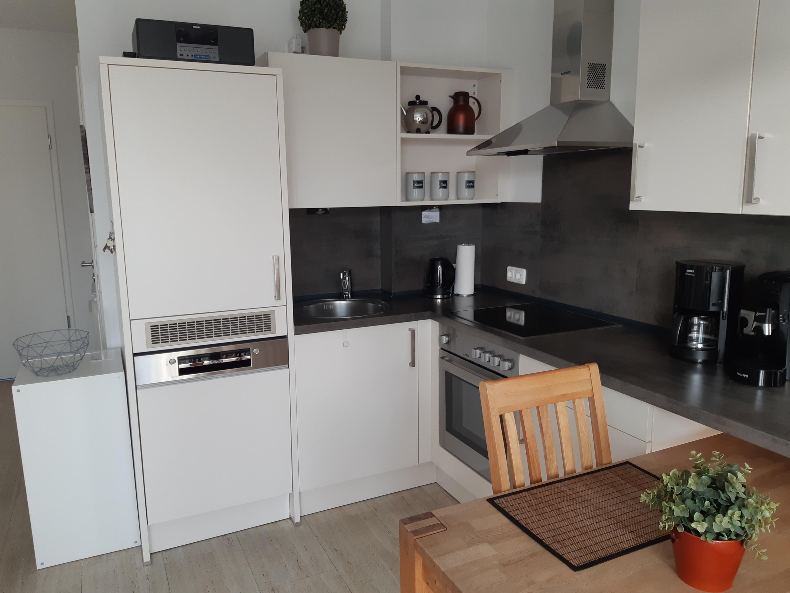 Die hier angrenzende Küchenzeile ist mit einem Kühlschrank mit Gefrierfach, einem Geschirrspüler und einem Backofen mit Cerankochfeld ausgestattet. Eine Kaffeemaschine, ein Toaster und ein Wasserkocher stehen Ihnen hier selbstverständlich zur Verfügung
