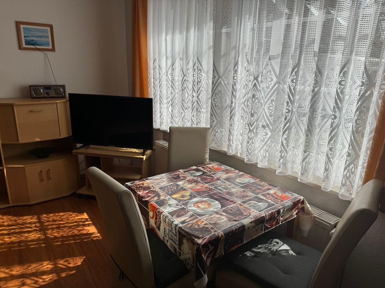 Der Bungalow 1 in Zinnowitz verfügt über einen Wohnraum, der mit Polstermöbeln, einem Esstisch, einem LCD-TV und einem Radio ausgestattet ist. Eine offene Küchenzeile ist ebenfalls vorhanden, ausgestattet mit einem E-Kochfeld, einem Kühlschrank, einer Mikrowelle und diversen anderen Küchengeräten. Der Schlafraum bietet ein Doppelbett und ein Einzelbett. Ein DU/WC befindet sich ebenfalls in der Wohnung.