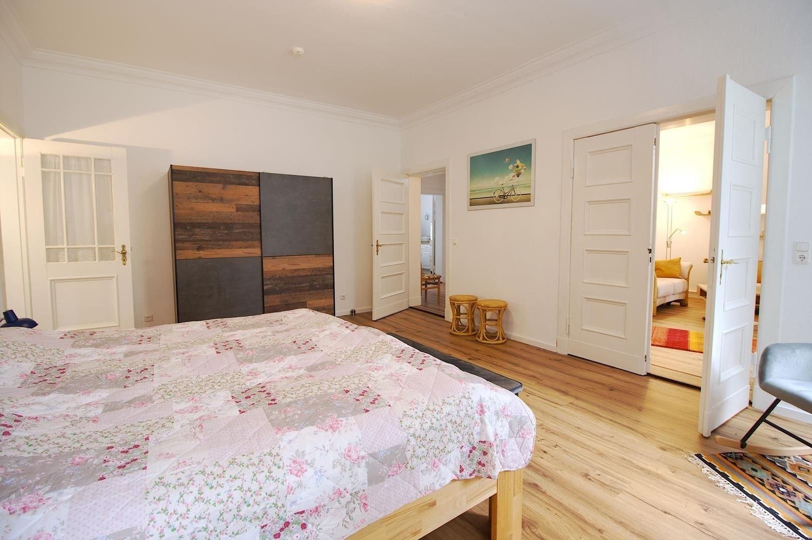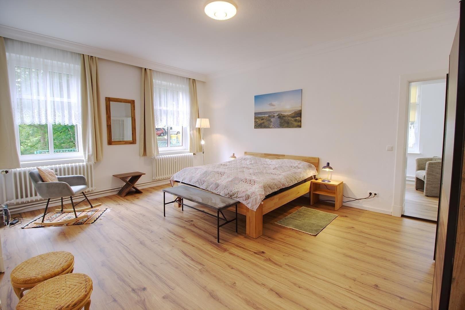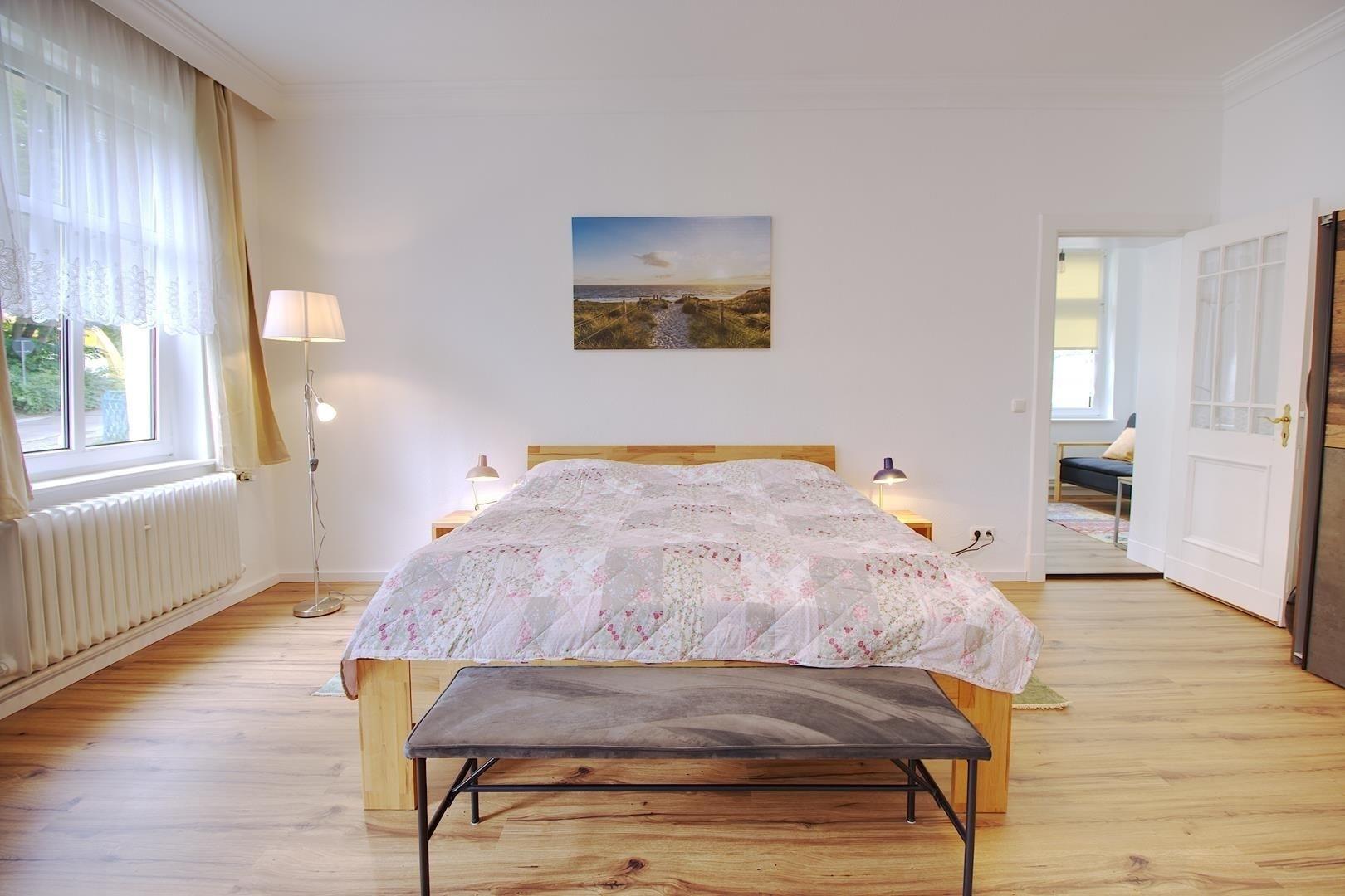 Die Wohnung verfügt über ein geräumiges Wohnzimmer, das durch einen kleinen Erker und eine Flügeltür mit dem Schlafzimmer verbunden ist. Wenn man die Räume getrennt halten möchte, kann man auch den Eingang über den Flur nutzen. Das Schlafzimmer ist mit einem komfortablen Bett in der Größe 1,80 x 2,00m ausgestattet und bietet durch seine Größe eine angenehme Atmosphäre. Neben dem Schlafzimmer gibt es eine gemütliche Veranda mit einer Schlafcouch (1,81 x 1,12 m), die als weiterer Schlafplatz genutzt werden kann.