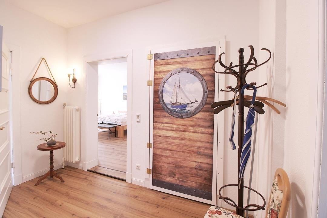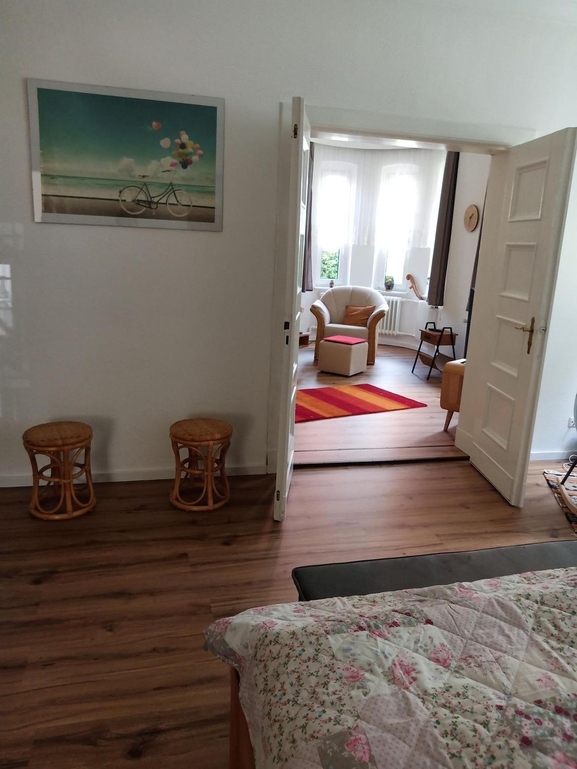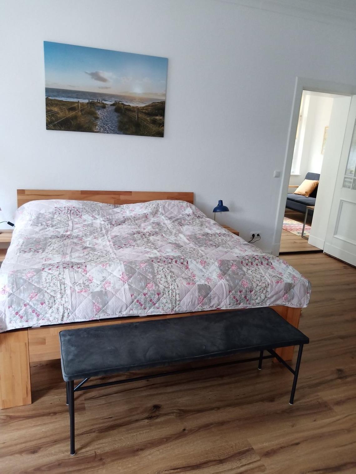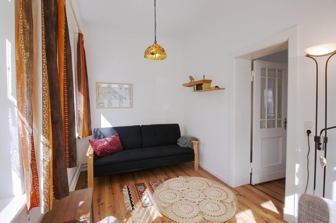 Die Wohnung verfügt über ein geräumiges Wohnzimmer, das durch einen kleinen Erker und eine Flügeltür mit dem Schlafzimmer verbunden ist. Wenn man die Räume getrennt halten möchte, kann man auch den Eingang über den Flur nutzen. Das Schlafzimmer ist mit einem komfortablen Bett in der Größe 1,80 x 2,00m ausgestattet und bietet durch seine Größe eine angenehme Atmosphäre. Neben dem Schlafzimmer gibt es eine gemütliche Veranda mit einer Schlafcouch (1,81 x 1,12 m), die als weiterer Schlafplatz genutzt werden kann.