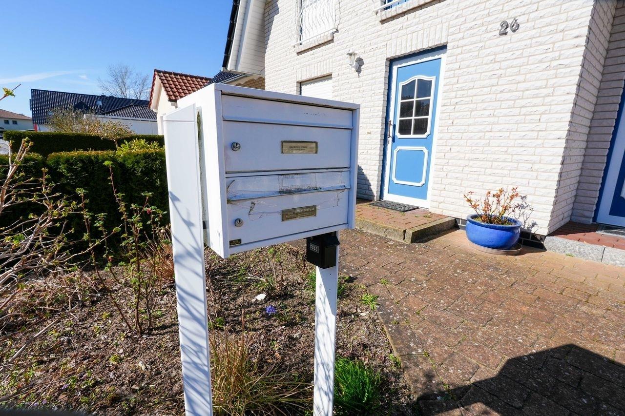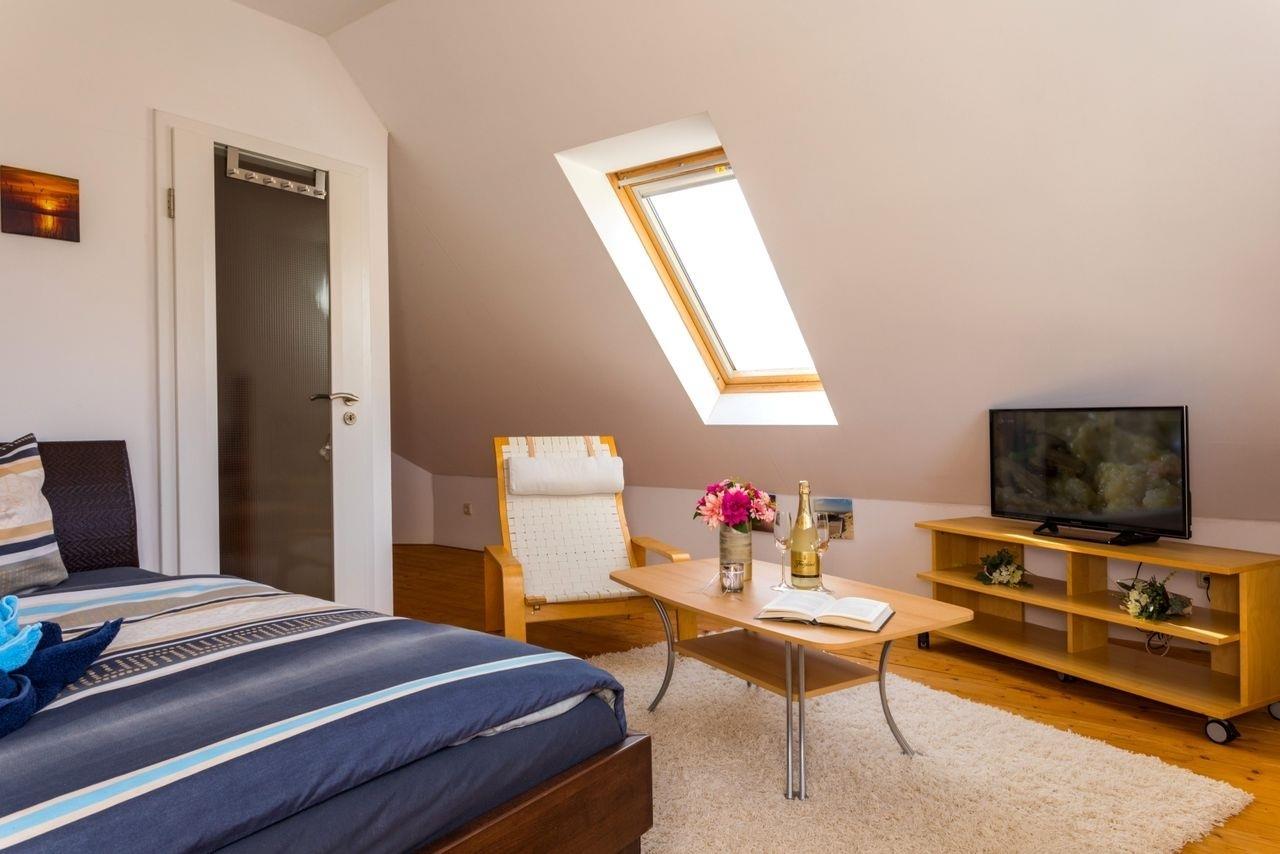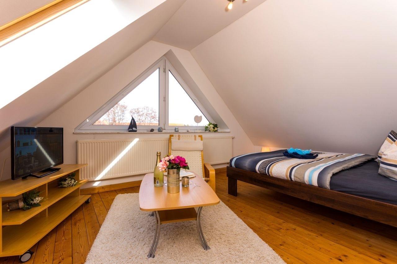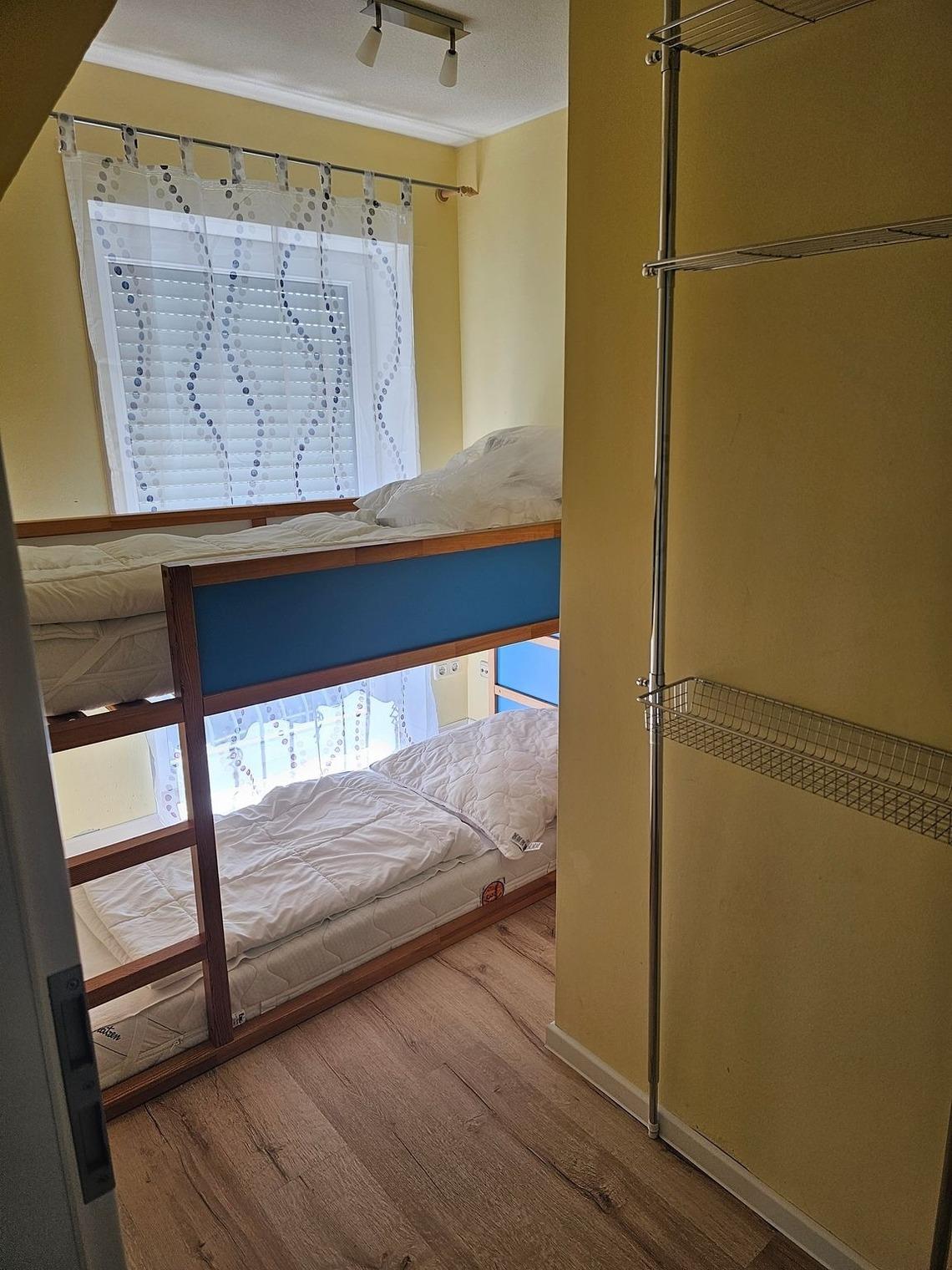 Im Dachgeschoss befinden sich zwei Schlafzimmer, eins mit einem Doppelbett (ca. 2,00m x 1,80m) und eins mit einem Doppelbett (ca. 2,00m x 1,60m). Es gibt außerdem eine Möglichkeit, Fahrräder abzustellen und einen PKW-Stellplatz. Der Strand ist ca. 10 Gehminuten entfernt. Ein Wäschepaket ist Bestandteil der Buchung und wird je nach gebuchter Gästezahl in der Ferienwohnung bereitgestellt.