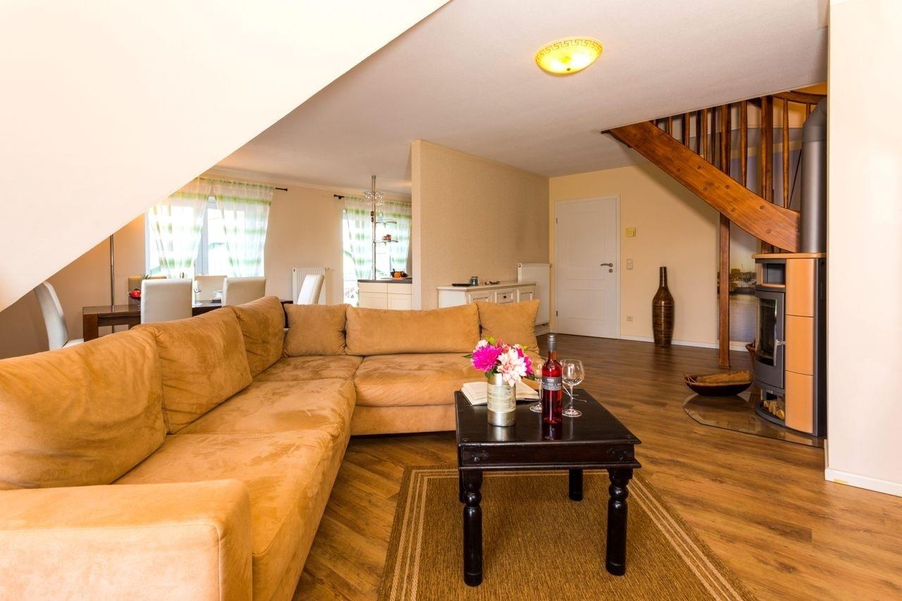 Im Erdgeschoss befindet sich ein HWR. Im Obergeschoss gibt es ein helles und geräumiges Wohnzimmer mit Esstisch, Flachbildfernseher, Kamin, gemütlicher großer Couch und einem Balkon. Außerdem gibt es eine offene und komplett ausgestattete Küche mit 4 Ceranfeldern, Backofen, Geschirrspüler, Kühlschrank, Gefrierschrank und Wasserkocher. Des Weiteren steht ein Badezimmer mit Badewanne, Dusche, WC und Haartrockner zur Verfügung. Ein Kinderzimmer mit Etagenbett (ca. 2,00m x 0,80m) ist ebenfalls vorhanden.
