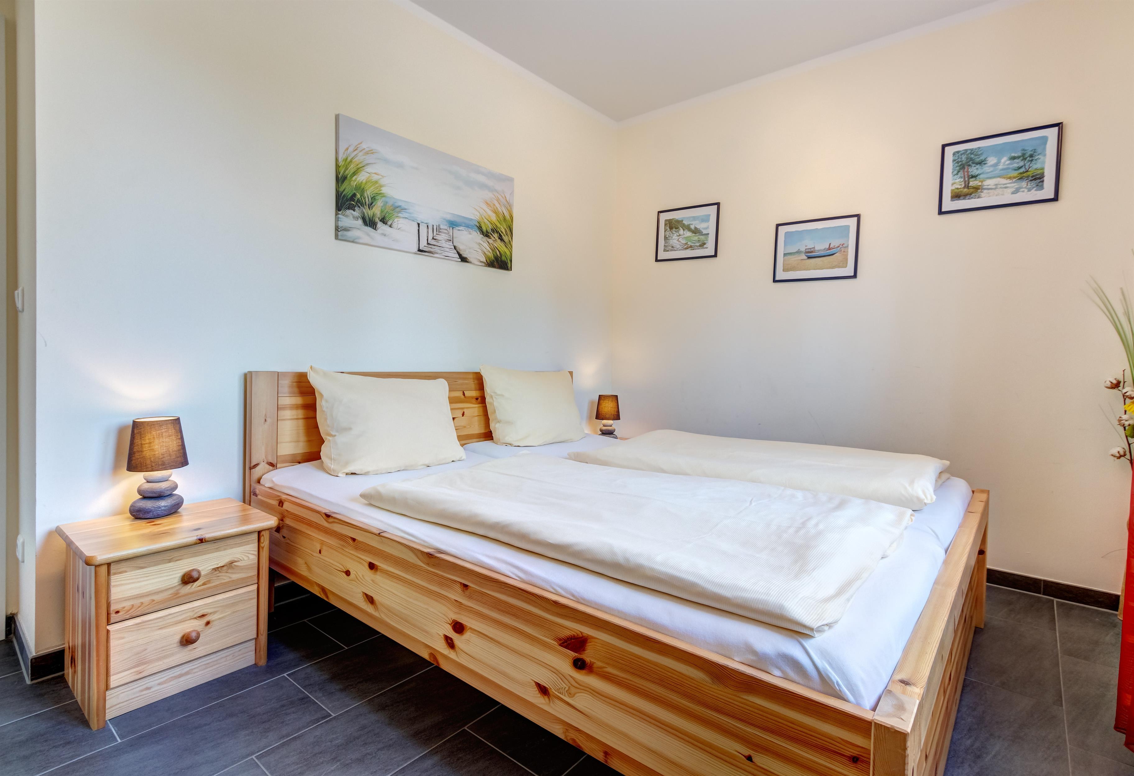 Es erwarten Sie zwei Schlafzimmer: eins mit einem Doppelbett, das andere mit einem französischen Bett.