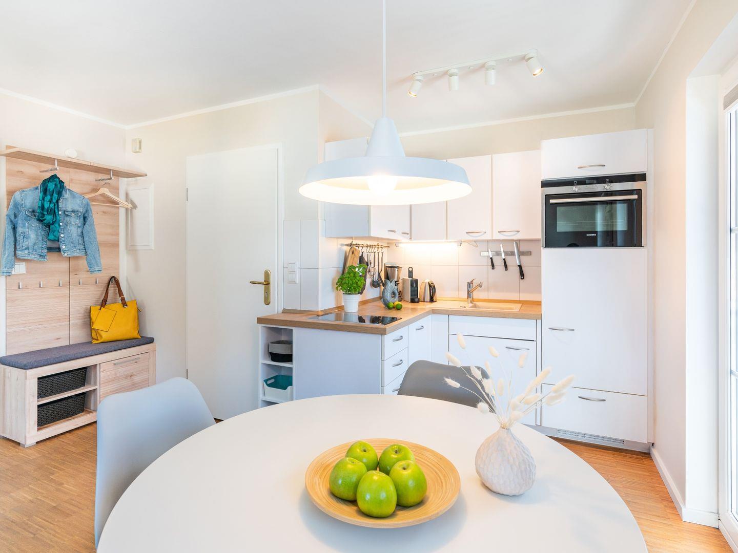 Die sonnige und liebevoll im skandinavischen Stil eingerichtete Wohnung ist ideal für zwei Erwachsene. Sie verfügt über einen einladenden Wohnbereich mit offener Küche, die mit hochwertigen Geräten ausgestattet ist, darunter eine Nespressomaschine für den perfekten Kaffeegenuss. Entspannen Sie sich im hellen Wohnbereich oder genießen Sie die Sonne auf dem Südbalkon.