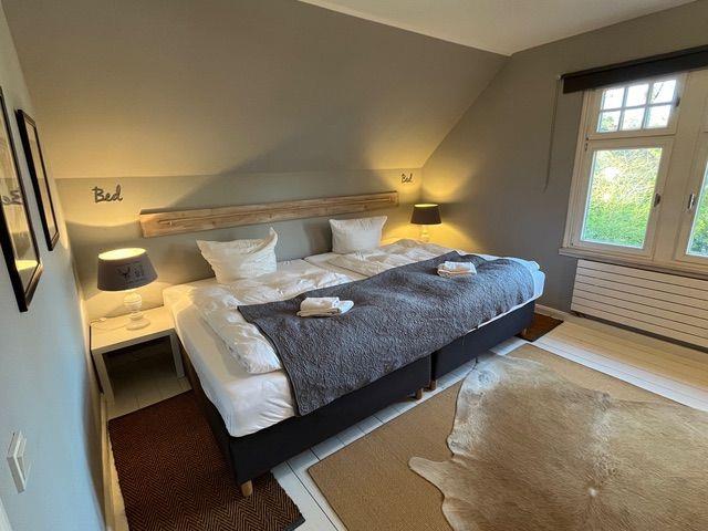 Im Erdgeschoss befindet sich zudem eines von drei Schlafzimmern, ausgestattet mit einem Boxspringdoppelbett (1,80 m x 2,00 m) und einem weiteren Flat-TV.