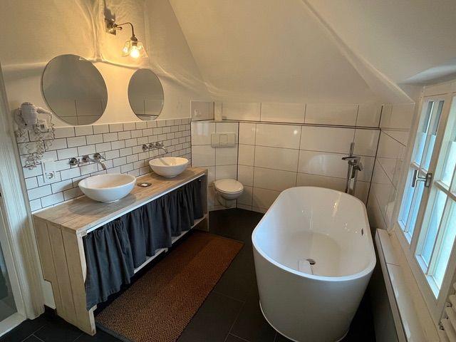 Zwei weitere Schlafzimmer finden Sie in der oberen Etage. Zur Spiel- und Traumwiese für die ganze Familie wird das XXL-Familien-Boxspringbett (2,80 m x 2,00 m) in einem der beiden Zimmer. Ob quer, längs oder gestreift – hier finden alle Kuschelsüchtigen und Pyjamaträger bequem Platz. Das zweite Schlafzimmer hat neben einem komfortablen Boxspringdoppelbett einen eigenen kleinen Balkon mit Blick in den Garten. Das großzügig geschnittene Badezimmer dieser Etage besitzt neben Toilette und zwei Waschtischen eine moderne freistehende Badewanne.