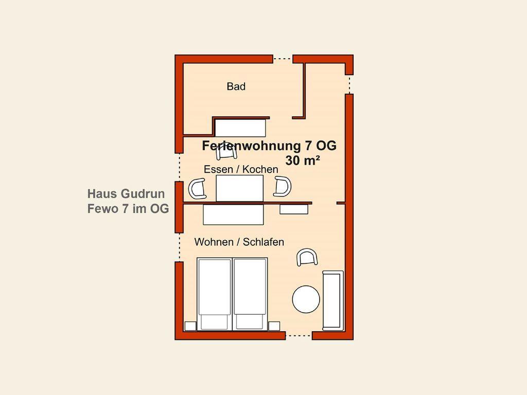 Die Ferienwohnung 7 im Haus Gudrun bietet auf 30 m² Platz für bis zu drei Personen. Sie verfügt über ein separates Schlafzimmer, ein modernes Badezimmer mit Dusche und Wanne, eine offene Küche zum Wohnzimmer sowie WLAN, TV und einen eigenen Parkplatz. Familien und Paare schätzen die ruhige Lage in Zinnowitz und die kindgerechte Ausstattung.