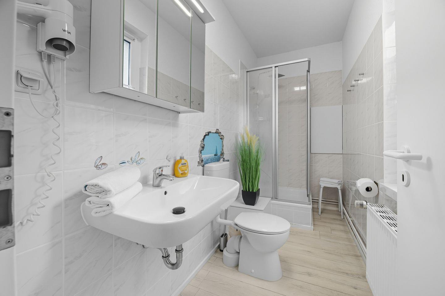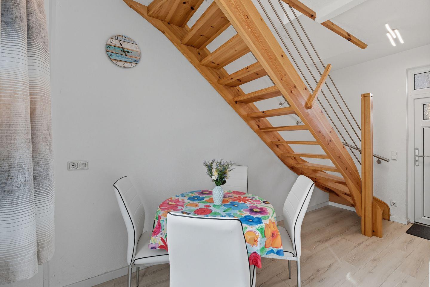 Die Ferienwohnung 8, eine großzügige Maisonette, bietet mit zwei Etagen und durchdachter Raumaufteilung den perfekten Rückzugsort für bis zu vier Personen. Im Erdgeschoss erwarten Sie ein einladendes Wohnzimmer mit Flachbild-TV, eine separate, voll ausgestattete Küche sowie ein modernes Badezimmer mit Dusche und WC.