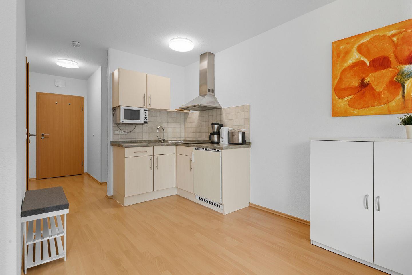 Erleben Sie erholsame Tage in der liebevoll eingerichteten Erdgeschosswohnung, die ideal für Paare oder Familien mit einem Kind ist. Der großzügige Wohnraum verfügt über eine gemütliche Sitzgruppe, bestehend aus einem bequemen Schlafsofa mit Sessel und Couchtisch, sowie einem extra Essbereich. Die voll ausgestattete Küchenzeile bietet alles, was Sie für Ihre Selbstversorgung benötigen. Ein separater Schlafraum mit Doppelbett sowie das helle, geräumige Badezimmer mit Tageslicht, Dusche und WC runden das Wohnensemble ab .