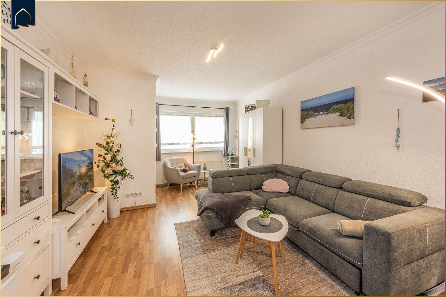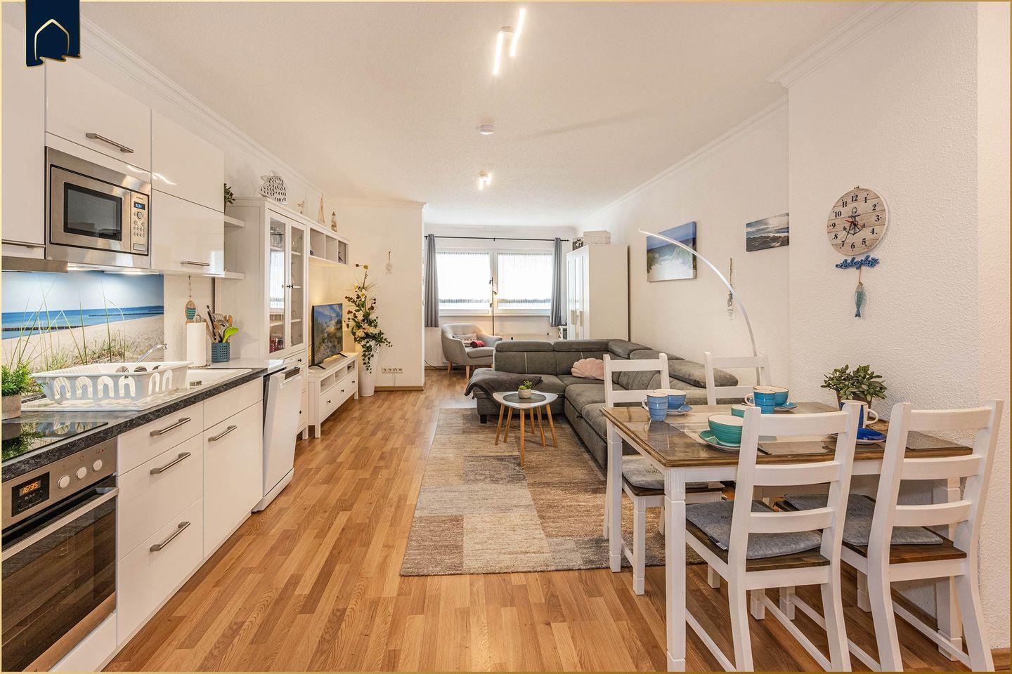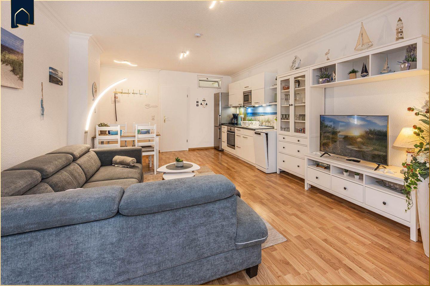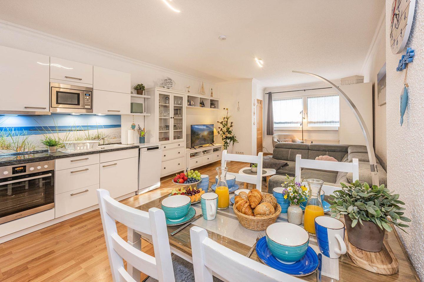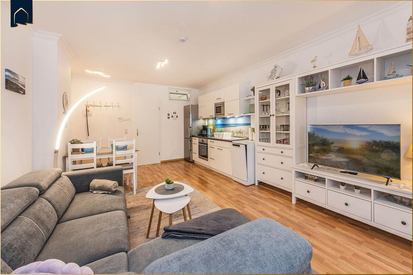 Mit einer Wohnfläche von rund 45 m² bietet die Ferienwohnung Platz für bis zu vier Personen. Das Schlafzimmer ist mit einem komfortablen Doppelbett sowie einem praktischen Etagenbett ausgestattet und eignet sich daher ideal für Familien mit Kindern. Der gemütliche Wohnbereich mit Sofa, Sessel und TV lädt zum Entspannen nach einem erlebnisreichen Urlaubstag ein. Ein separater Essbereich mit Esstisch bietet genügend Platz für gemeinsame Mahlzeiten oder gesellige Spieleabende.