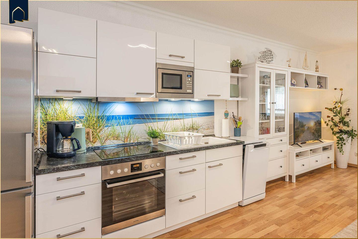 Die gut ausgestattete Küche verfügt über Herd, Backofen, Mikrowelle, Kühlschrank mit Gefrierfach, Kaffeemaschine, Toaster, Wasserkocher und Eierkocher – ideal für die Selbstversorgung im Urlaub. Zusätzlich stehen ein Badezimmer mit Dusche sowie ein separates Gäste-WC zur Verfügung. WLAN, Bücher und Spiele sorgen auch an ruhigeren Tagen für Unterhaltung. Fliegengitter, Sichtschutz an den Fenstern und viele praktische Details tragen zu einem angenehmen Aufenthalt bei. Ein privater Parkplatz direkt an der Unterkunft rundet das Angebot ab.
