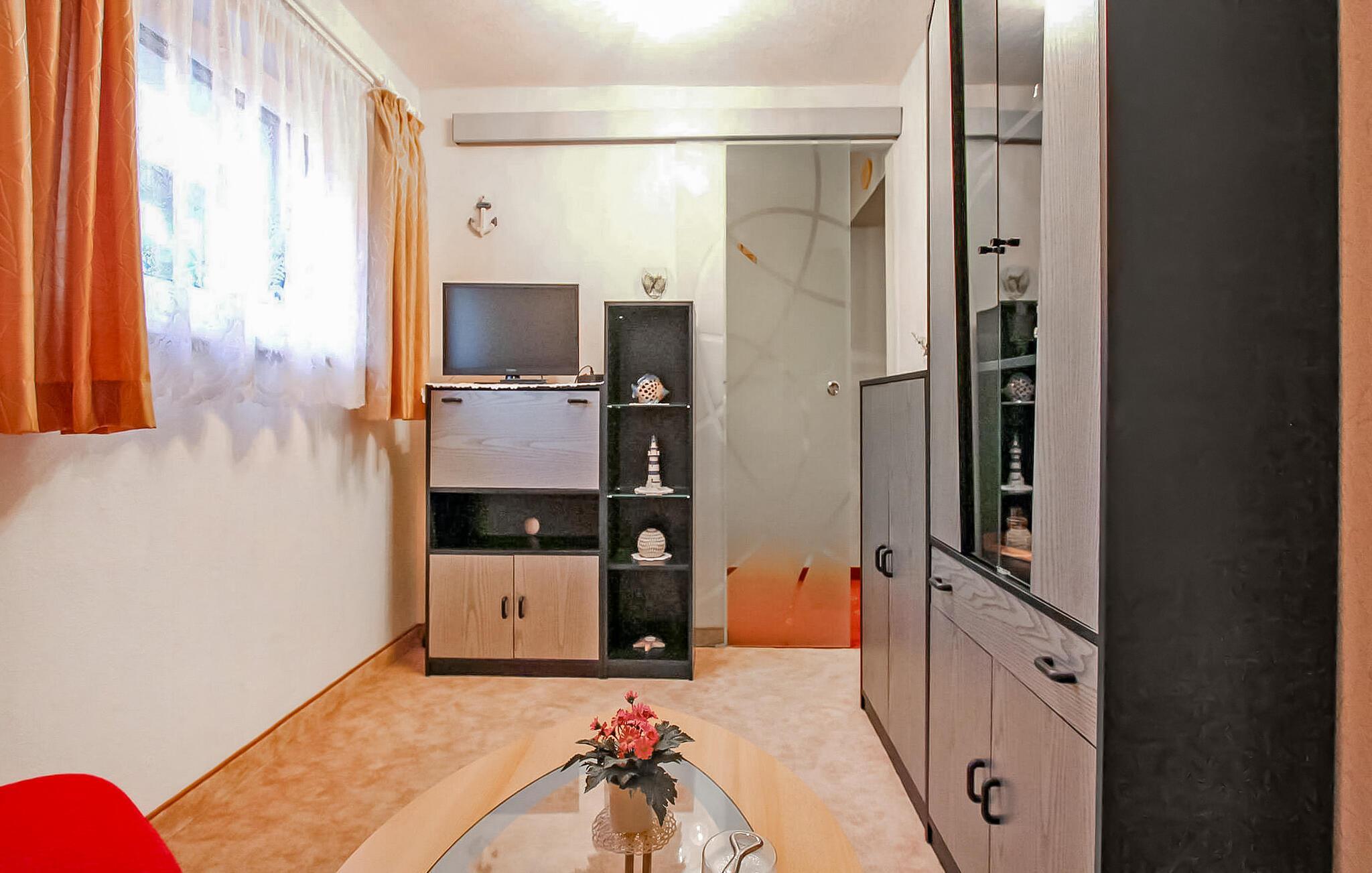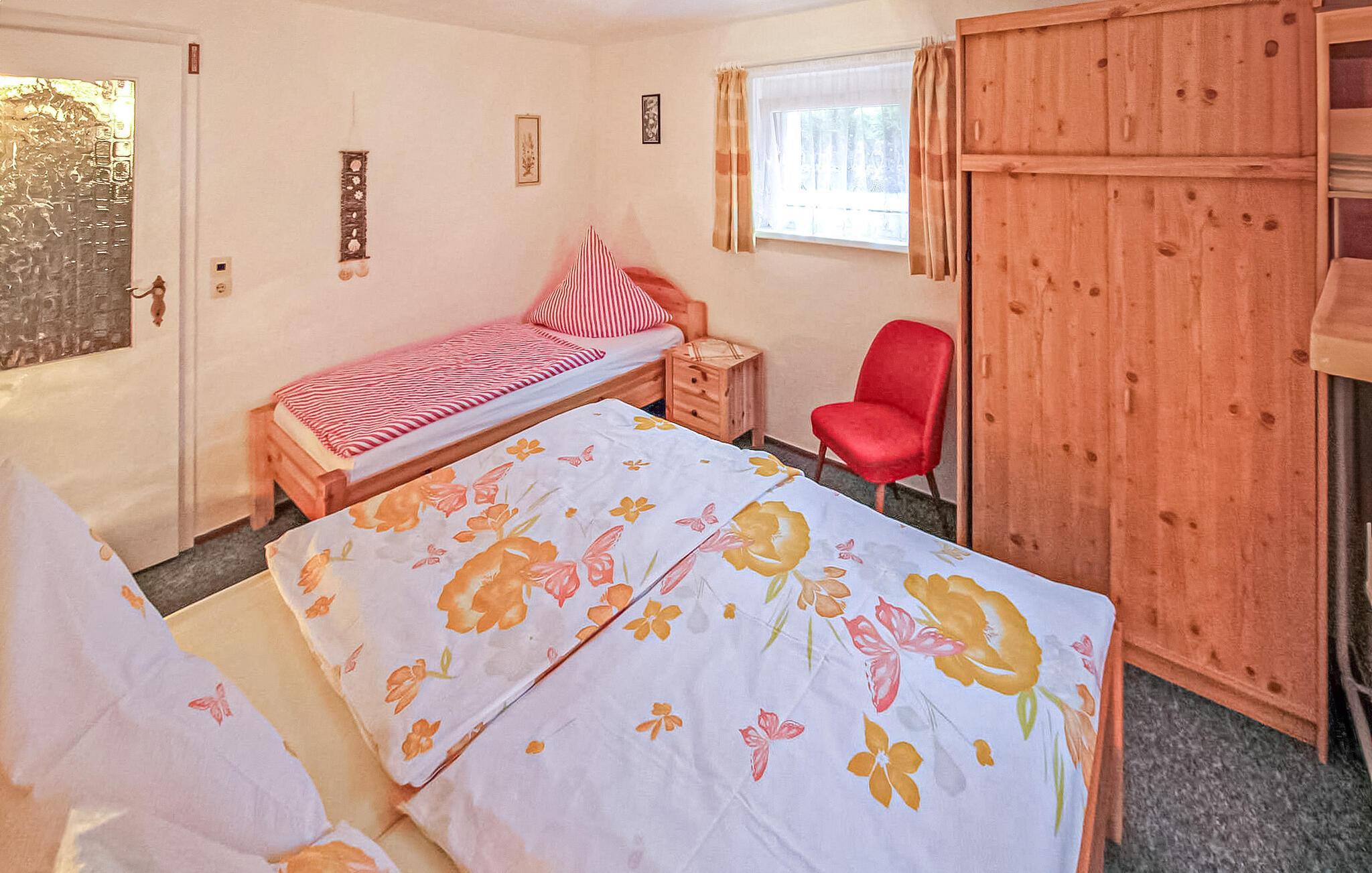Die etwa 53 Quadratmeter große Ferienwohnung befindet sich im Untergeschoss des Wohnhauses des Eigentümers auf einem etwa 1400 Quadratmeter großen und vollständig umzäunten Grundstück. Bis zur Einkaufsmöglichkeit sind es circa 500 Meter, eine Gaststätte befindet sich in etwa 2 km, bis zum Ostseestrand sind es etwa 7 km.Die Ferienwohnung hat einen separaten Zugang, bietet Platz für bis zu 3 Personen und ist ausgestattet mit einem Wohnzimmer mit Polstermöbel, Flachbild-TV und Radio und einer kleinen Küche mit E-Kochfeld (2 Platten), Kühlschrank mit Tiefkühlfach, Mikrowelle, div. Küchenkleingeräten und Essecke. Außerdem verfügt die Wohnung über ein Schlafzimmer mit Doppel- und Einzelbett sowie über ein Badezimmer mit WC, Dusche und Fön. Die Wohnung ist mit einer Zentralheizung ausgestattet. Das Rauchen ist ausschließlich im Freien erlaubt.Außerdem zur Verfügung stehen: W-LAN, Sitzecke im Garten mit Grill, Fahrradabstellraum, Parkplatz.Im Gesamtpreis enthalten sind: Bettwäsche, Handtücher, Wasser- und Energieverbrauch.