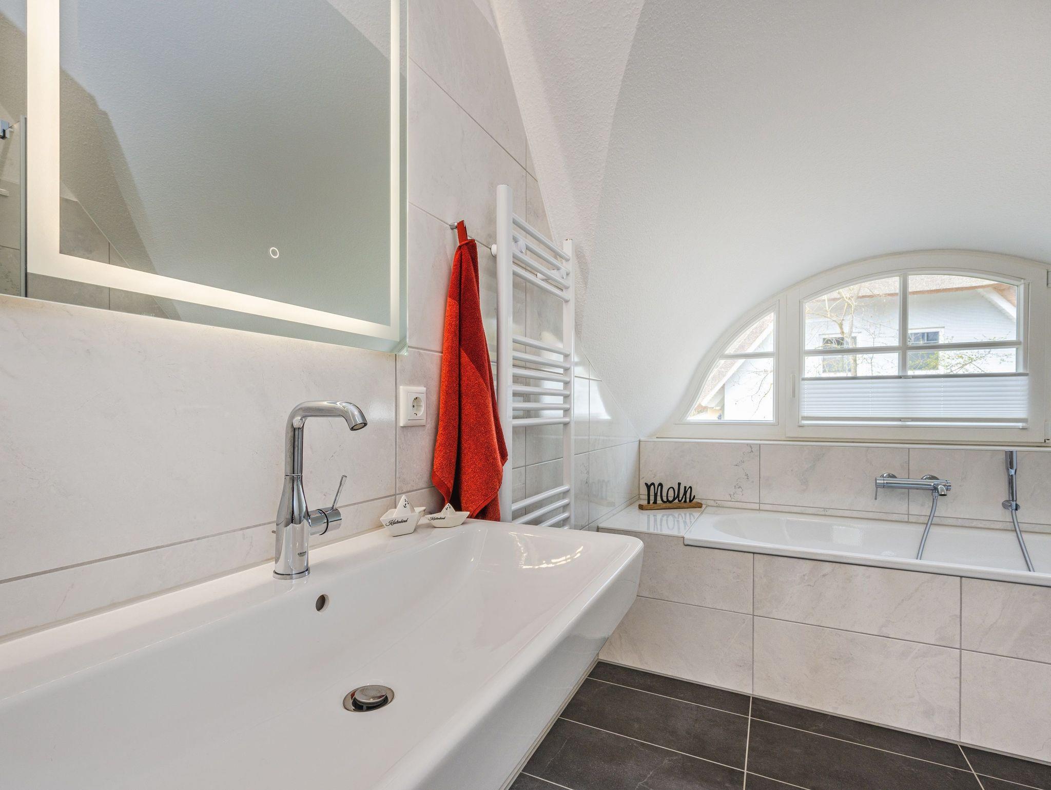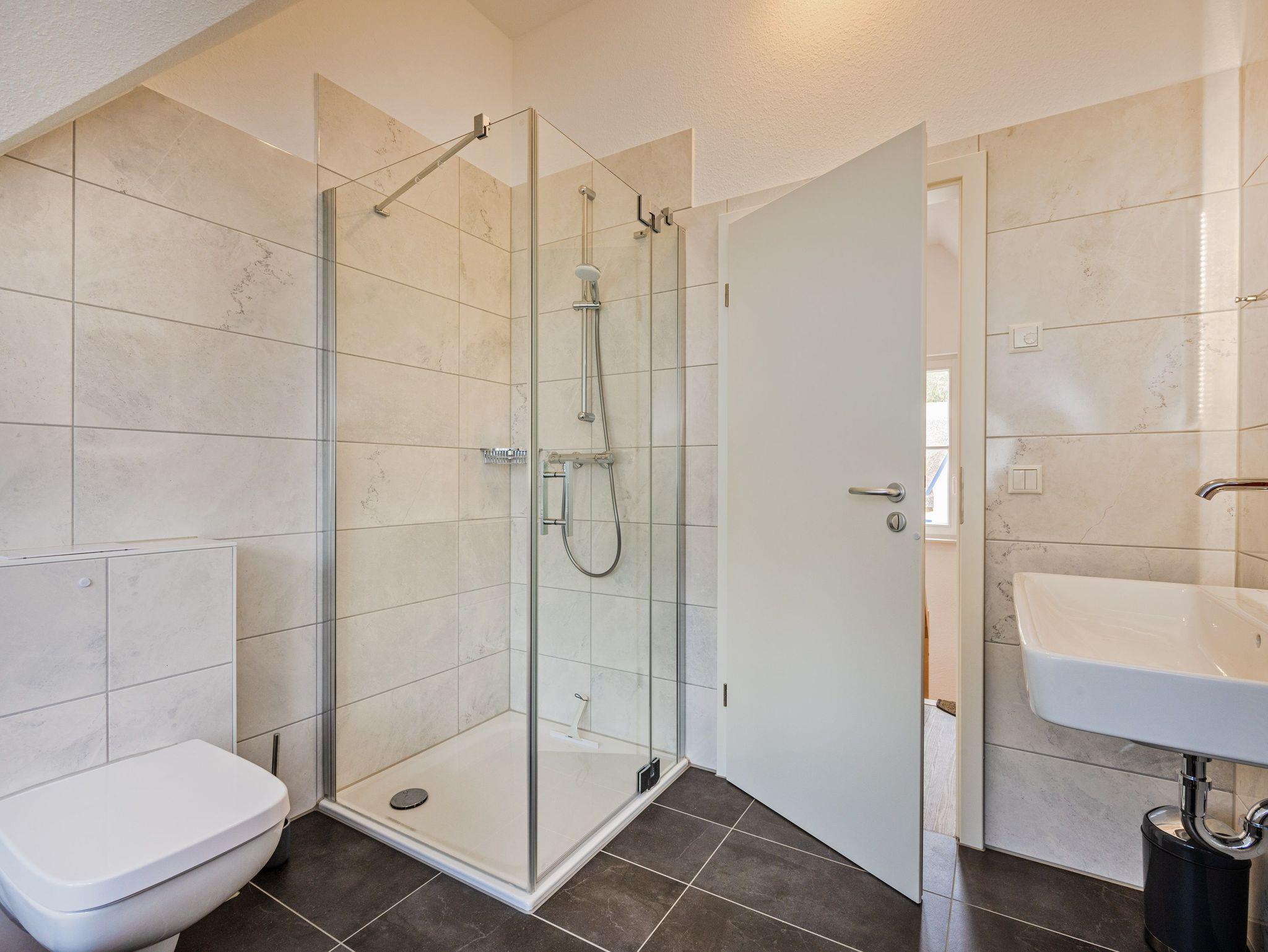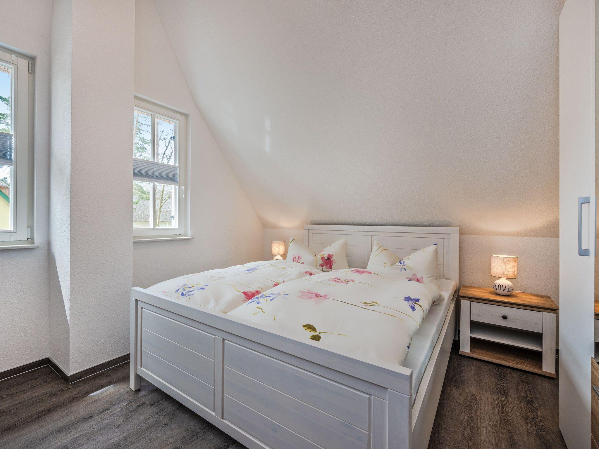 Zwei Schlafzimmer mit je einem Doppelbett und Kleiderschränken befinden sich im Obergeschoß und bieten ausreichend Rückzugsraum. Ein weiteres Badezimmer mit Dusche und Badewanne sorgt für zusätzlichen Komfort.